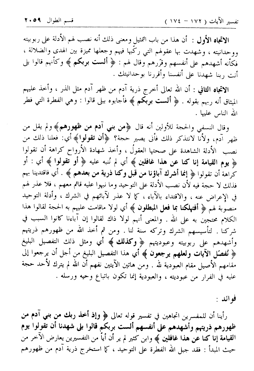 الاتجاه الثاني: أن الله تعالى أخرج ذرية آدم من ظهر آدم مثل الذر، وأخذ عليهم الميثاق أنه ربهم بقوله. أَلَسْتُ بِرَبِّكُمْ فأجابوه ببلى قالوا: وهي الفطرة التي فطر الله الناس عليها.