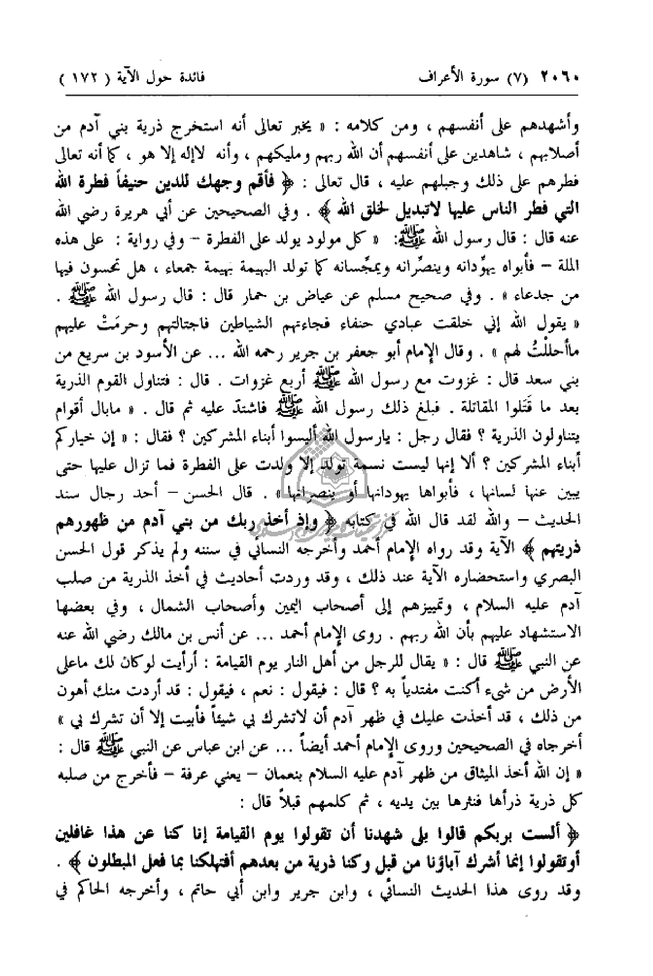 وأشهدهم على أنفسهم، ومن كلامه: «يخبر تعالى أنه استخرج ذرية بني آدم من أصلابهم، شاهدين على أنفسهم أن الله ربهم ومليكهم، وأنه لا إله إلا هو، كما أنه تعالى فطرهم على ذلك وجبلهم عليه، قال تعالى: فَأَقِمْ وَجْهَكَ لِلدِّينِ حَنِيفاً فِطْرَتَ اللَّهِ الَّتِي فَطَرَ النَّاسَ عَلَيْها لا تَبْدِيلَ لِخَلْقِ اللَّهِ. وفي الصحيحين عن أبي هريرة رضي الله عنه قال: قال رسول الله صلى الله عليه وسلم: «كل مولود يولد على الفطرة- وفي رواية: على هذه الملة- فأبواه يهودانه وينصرانه ويمجسانه كما تولد البهيمة بهيمة جمعاء، هل تحسون فيها من جدعاء». وفي صحيح مسلم عن عياض بن حمار قال: قال رسول الله صلى الله عليه وسلم.