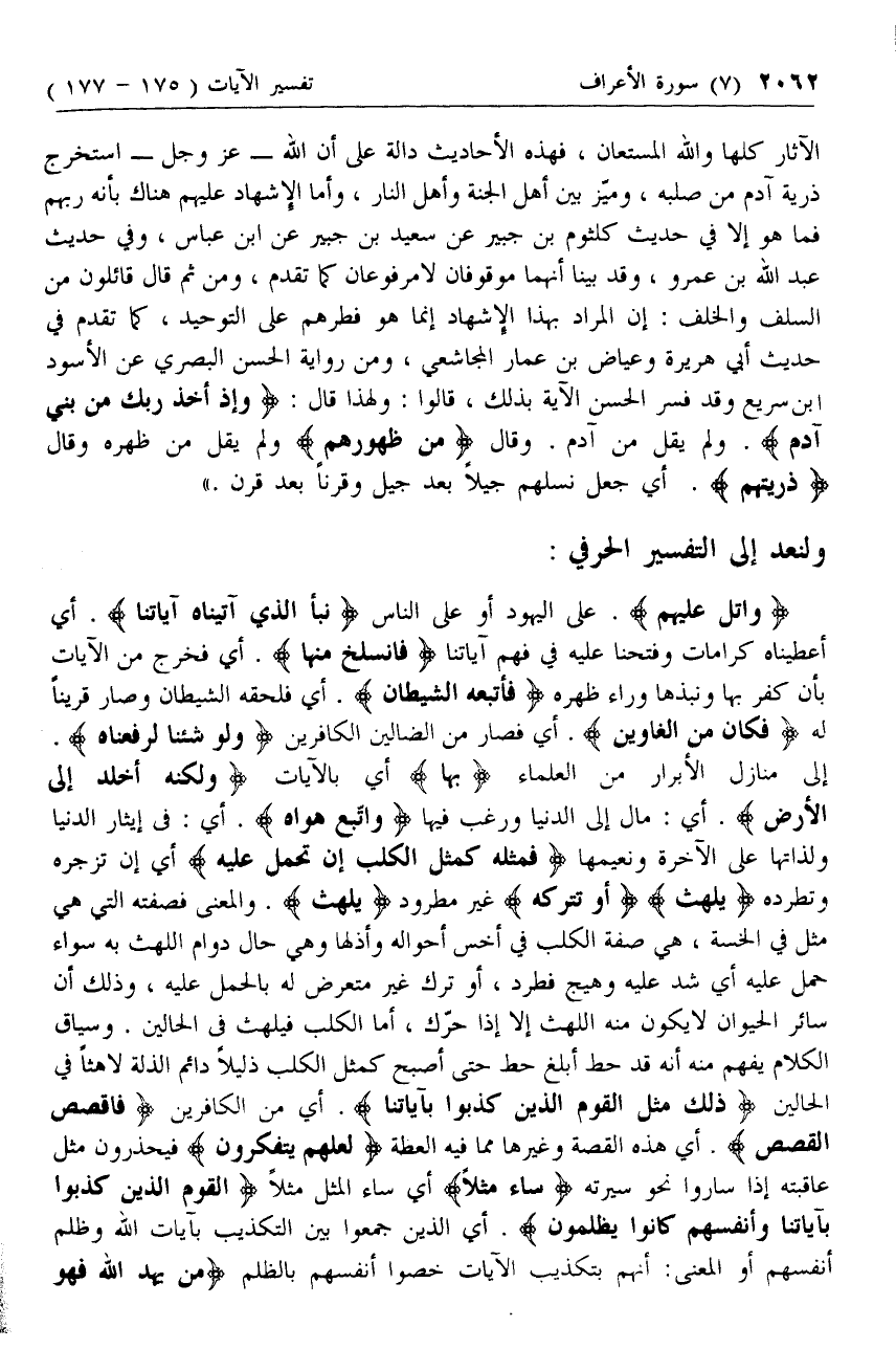 إلى منازل الأبرار من العلماء بِها أي بالآيات وَلكِنَّهُ أَخْلَدَ إِلَى الْأَرْضِ. أي: مال إلى الدنيا ورغب فيها وَاتَّبَعَ هَواهُ. أي: فى إيثار الدنيا ولذاتها على الآخرة ونعيمها فَمَثَلُهُ كَمَثَلِ الْكَلْبِ إِنْ تَحْمِلْ عَلَيْهِ أي إن تزجره وتطرده يَلْهَثْ أَوْ تَتْرُكْهُ غير مطرود يَلْهَثْ. والمعنى فصفته التي هي مثل في الخسة، هي صفة الكلب في أخس أحواله وأذلها وهي حال دوام اللهث به سواء حمل عليه أي شد عليه وهيج فطرد، أو ترك غير متعرض له بالحمل عليه، وذلك أن سائر الحيوان لا يكون منه اللهث إلا إذا حرك، أما الكلب فيلهث فى الحالين. وسياق الكلام يفهم منه أنه قد حط أبلغ حط حتى أصبح كمثل الكلب ذليلا دائم الذلة لاهثا في الحالين ذلِكَ مَثَلُ الْقَوْمِ الَّذِينَ كَذَّبُوا بِآياتِنا. أي من الكافرين فَاقْصُصِ الْقَصَصَ. أي هذه القصة وغيرها مما فيه العظة لَعَلَّهُمْ يَتَفَكَّرُونَ فيحذرون مثل عاقبته إذا ساروا نحو سيرته