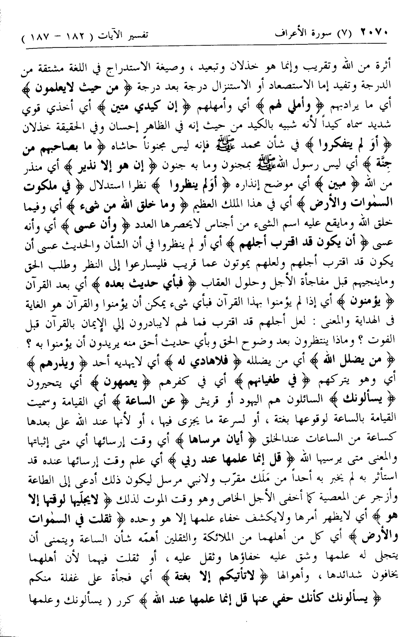 يَسْئَلُونَكَ السائلون هم اليهود أو قريش عَنِ السَّاعَةِ أي القيامة وسميت القيامة بالساعة لوقوعها بغتة، أو لسرعة ما يجزى فيها، أو لأنها عند الله على بعدها كساعة من الساعات عند الخلق أَيَّانَ مُرْساها أي وقت إرسائها أي متى إثباتها والمعنى متى يرسيها الله قُلْ إِنَّما عِلْمُها عِنْدَ رَبِّي أي علم وقت إرسائها عنده قد استأثر به لم يخبر به أحدا من ملك مقرب ولا نبي مرسل ليكون ذلك أدعى إلى الطاعة وأزجر عن المعصية كما أخفى الأجل الخاص وهو وقت الموت لذلك لا يُجَلِّيها لِوَقْتِها إِلَّا هُوَ أي لا يظهر أمرها ولا يكشف خفاء علمها إلا هو وحده ثَقُلَتْ فِي السَّماواتِ وَالْأَرْضِ أي كل من أهلهما من الملائكة والثقلين أهمه شأن الساعة ويتمنى أن يتجلى له علمها وشق عليه خفاؤها وثقل عليه، أو ثقلت فيهما لأن أهلهما يخافون شدائدها، وأهوالها لا تَأْتِيكُمْ إِلَّا بَغْتَةً أي فجأة على غفلة منكم يَسْئَلُونَكَ كَأَنَّكَ حَفِيٌّ عَنْها قُلْ إِنَّما عِلْمُها عِنْدَ اللَّهِ كرر (يسألونك وعلمها