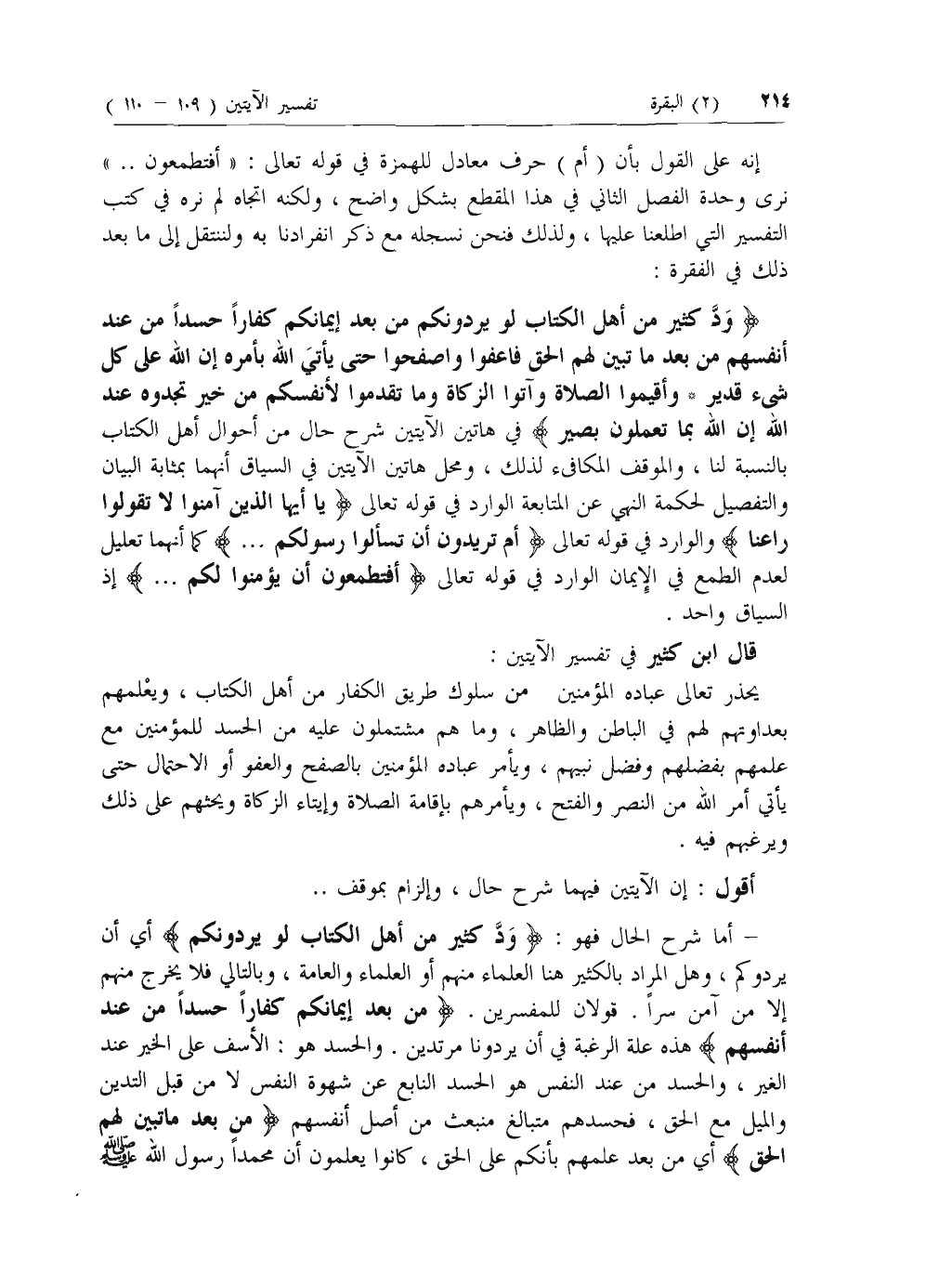 وَدَّ كَثِيرٌ مِنْ أَهْلِ الْكِتابِ لَوْ يَرُدُّونَكُمْ مِنْ بَعْدِ إِيمانِكُمْ كُفَّاراً حَسَداً مِنْ عِنْدِ أَنْفُسِهِمْ مِنْ بَعْدِ ما تَبَيَّنَ لَهُمُ الْحَقُّ فَاعْفُوا وَاصْفَحُوا حَتَّى يَأْتِيَ اللَّهُ بِأَمْرِهِ إِنَّ اللَّهَ عَلى كُلِّ شَيْءٍ قَدِيرٌ* وَأَقِيمُوا الصَّلاةَ وَآتُوا الزَّكاةَ وَما تُقَدِّمُوا لِأَنْفُسِكُمْ مِنْ خَيْرٍ تَجِدُوهُ عِنْدَ اللَّهِ إِنَّ اللَّهَ بِما تَعْمَلُونَ بَصِيرٌ في هاتين الآيتين شرح حال من أحوال أهل الكتاب بالنسبة لنا، والموقف المكافئ لذلك، ومحل هاتين الآيتين في السياق أنهما بمثابة البيان والتفصيل لحكمة النهي عن المتابعة الوارد في قوله تعالى يا أَيُّهَا الَّذِينَ آمَنُوا لا تَقُولُوا راعِنا والوارد في قوله تعالى أَمْ تُرِيدُونَ أَنْ تَسْئَلُوا رَسُولَكُمْ ... كما أنهما تعليل لعدم الطمع في الإيمان الوارد في قوله تعالى أَفَتَطْمَعُونَ أَنْ يُؤْمِنُوا لَكُمْ ... إذ السياق واحد.