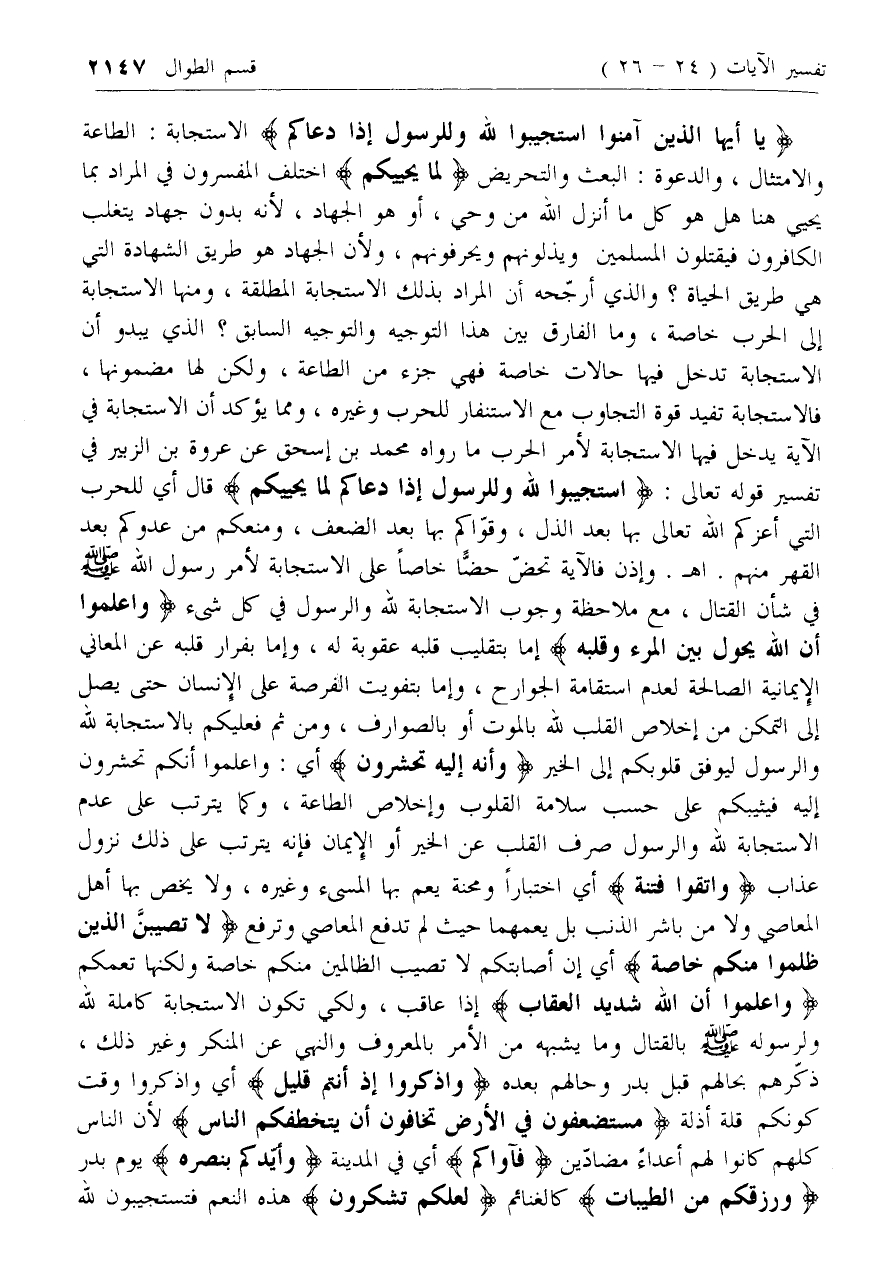 يا أَيُّهَا الَّذِينَ آمَنُوا اسْتَجِيبُوا لِلَّهِ وَلِلرَّسُولِ إِذا دَعاكُمْ الاستجابة: الطاعة والامتثال، والدعوة: البعث والتحريض لِما يُحْيِيكُمْ اختلف المفسرون في المراد بما يحيي هنا هل هو كل ما أنزل الله من وحي، أو هو الجهاد، لأنه بدون جهاد يتغلب الكافرون فيقتلون المسلمين ويذلونهم ويحرفونهم، ولأن الجهاد هو طريق الشهادة التي هي طريق الحياة؟ والذي أرجحه أن المراد بذلك الاستجابة المطلقة، ومنها الاستجابة إلى الحرب خاصة، وما الفارق بين هذا التوجيه والتوجيه السابق؟ الذي يبدو أن الاستجابة تدخل فيها حالات خاصة فهي جزء من الطاعة، ولكن لها مضمونها، فالاستجابة تفيد قوة التجاوب مع الاستنفار للحرب وغيره، ومما يؤكد أن الاستجابة في الآية يدخل فيها الاستجابة لأمر الحرب ما رواه محمد بن إسحاق عن عروة بن الزبير في تفسير قوله تعالى: اسْتَجِيبُوا لِلَّهِ وَلِلرَّسُولِ إِذا دَعاكُمْ لِما يُحْيِيكُمْ قال أي للحرب التي أعزكم الله تعالى بها بعد الذل، وقواكم بها بعد الضعف، ومنعكم من عدوكم بعد القهر منهم. اه. وإذن فالآية تحض حضا خاصا على الاستجابة لأمر رسول الله صلى الله عليه وسلم في شأن القتال، مع ملاحظة وجوب الاستجابة لله والرسول في كل شئ وَاعْلَمُوا أَنَّ اللَّهَ يَحُولُ بَيْنَ الْمَرْءِ وَقَلْبِهِ إما بتقليب قلبه عقوبة له، وإما بفرار قلبه عن المعاني الإيمانية الصالحة لعدم استقامة الجوارح، وإما بتفويت الفرصة على الإنسان حتى يصل إلى التمكن من إخلاص القلب لله بالموت أو بالصوارف، ومن ثم فعليكم بالاستجابة لله والرسول ليوفق قلوبكم إلى الخير وَأَنَّهُ إِلَيْهِ تُحْشَرُونَ أي: واعلموا أنكم تحشرون إليه فيثيبكم على حسب سلامة القلوب وإخلاص الطاعة، وكما يترتب على عدم الاستجابة لله والرسول صرف القلب عن الخير أو الإيمان فإنه يترتب على ذلك نزول عذاب