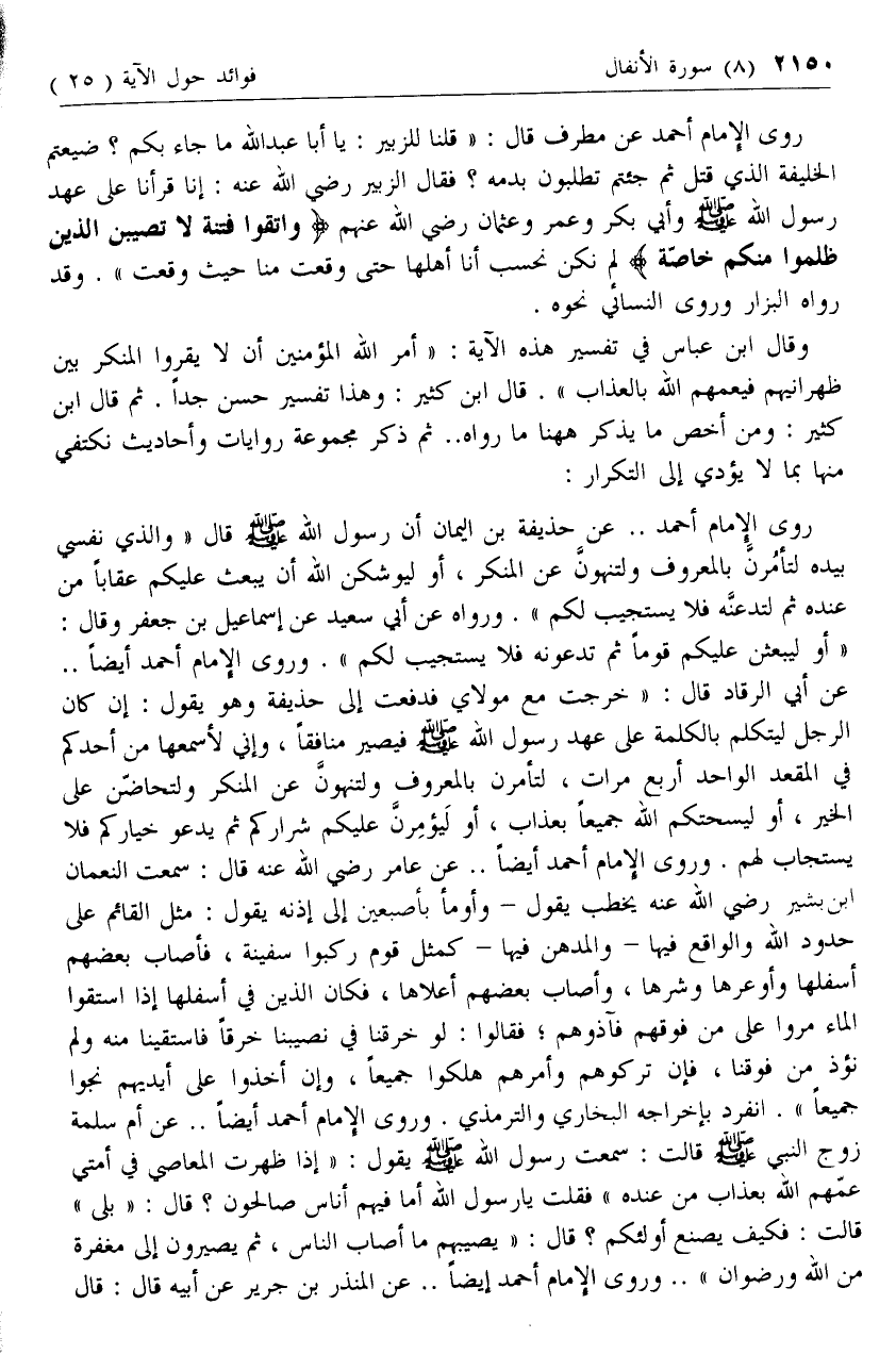 وقال ابن عباس في تفسير هذه الآية: «أمر الله المؤمنين أن لا يقروا المنكر بين ظهرانيهم فيعمهم الله بالعذاب». قال ابن كثير: وهذا تفسير حسن جدا. ثم قال ابن كثير: ومن أخص ما يذكر هاهنا ما رواه .. ثم ذكر مجموعة روايات وأحاديث نكتفي منها بما لا يؤدي إلى التكرار: