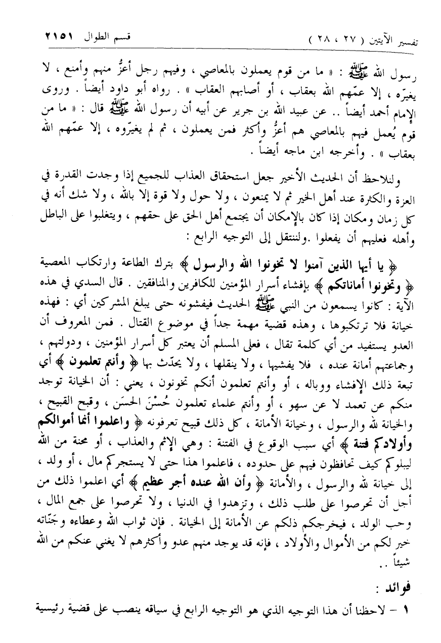 يا أَيُّهَا الَّذِينَ آمَنُوا لا تَخُونُوا اللَّهَ وَالرَّسُولَ بترك الطاعة وارتكاب المعصية وَتَخُونُوا أَماناتِكُمْ بإفشاء أسرار المؤمنين للكافرين والمنافقين. قال السدي في هذه الآية: كانوا يسمعون من النبي صلى الله عليه وسلم الحديث فيفشونه حتى يبلغ المشركين أي: فهذه خيانة فلا ترتكبوها، وهذه قضية مهمة جدا في موضوع القتال. فمن