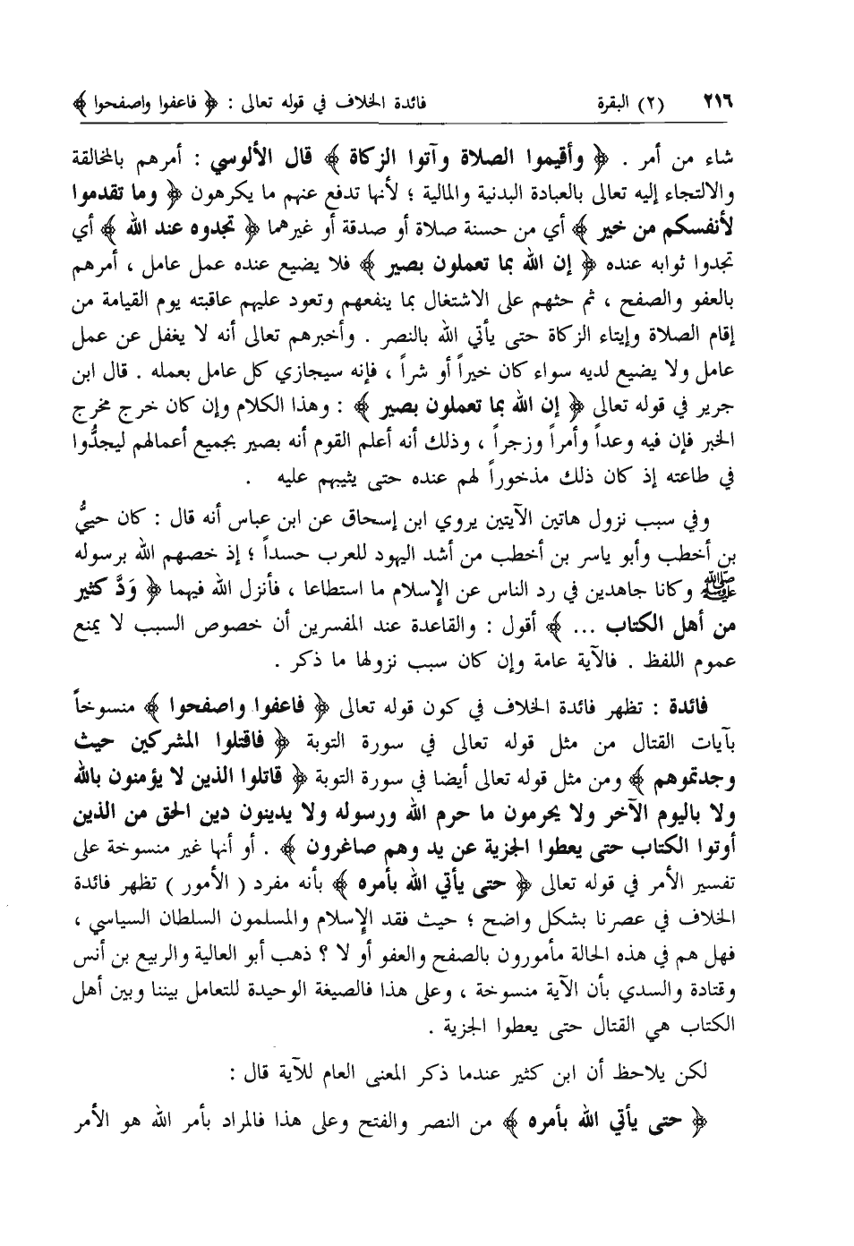 فائدة: تظهر فائدة الخلاف في كون قوله تعالى فَاعْفُوا وَاصْفَحُوا منسوخا بآيات القتال من مثل قوله تعالى في سورة التوبة فَاقْتُلُوا الْمُشْرِكِينَ حَيْثُ وَجَدْتُمُوهُمْ ومن مثل قوله تعالى أيضا في سورة التوبة قاتِلُوا الَّذِينَ لا يُؤْمِنُونَ بِاللَّهِ وَلا بِالْيَوْمِ الْآخِرِ وَلا يُحَرِّمُونَ ما حَرَّمَ اللَّهُ وَرَسُولُهُ وَلا يَدِينُونَ دِينَ الْحَقِّ مِنَ الَّذِينَ أُوتُوا الْكِتابَ حَتَّى يُعْطُوا الْجِزْيَةَ عَنْ يَدٍ وَهُمْ صاغِرُونَ. أو أنها غير منسوخة على تفسير الأمر في قوله تعالى حَتَّى يَأْتِيَ اللَّهُ بِأَمْرِهِ بأنه مفرد (الأمور) تظهر فائدة الخلاف في عصرنا بشكل واضح؛ حيث فقد الإسلام والمسلمون السلطان السياسي، فهل هم في هذه الحالة مأمورون بالصفح والعفو أو لا؟ ذهب أبو العالية والربيع بن أنس وقتادة والسدي بأن الآية منسوخة، وعلى هذا فالصيغة الوحيدة للتعامل بيننا وبين أهل الكتاب هي القتال حتى يعطوا الجزية.