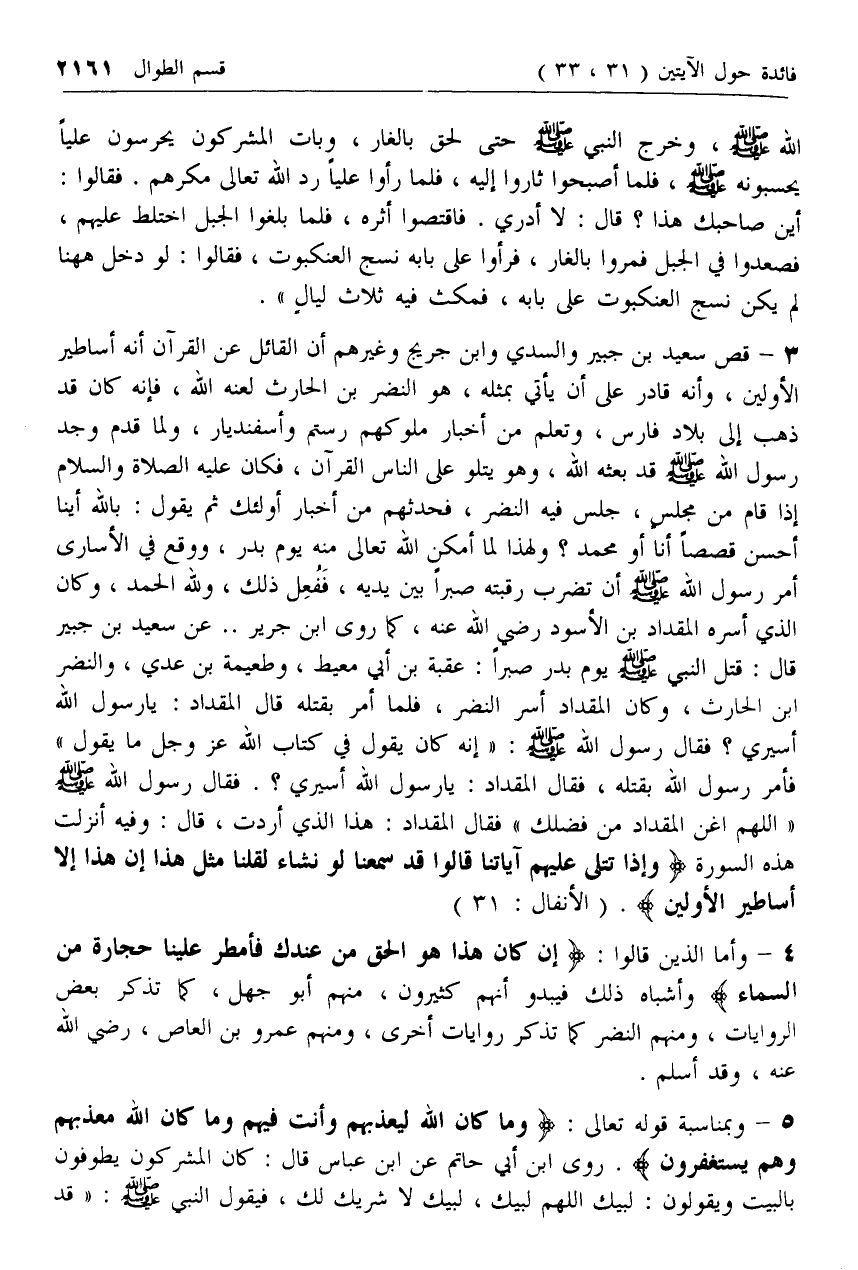 3 - قص سعيد بن جبير والسدي وابن جريج وغيرهم أن القائل عن القرآن أنه أساطير الأولين، وأنه قادر على أن يأتي بمثله، هو النضر بن الحارث لعنه الله، فإنه كان قد ذهب إلى بلاد فارس، وتعلم من أخبار ملوكهم رستم وإسفنديار، ولما قدم وجد رسول الله صلى الله عليه وسلم قد بعثه الله، وهو يتلو على الناس القرآن، فكان عليه الصلاة والسلام إذا قام من مجلس، جلس فيه النضر، فحدثهم من أخبار أولئك ثم يقول: بالله أينا أحسن قصصا أنا أو محمد؟ ولهذا لما أمكن الله تعالى منه يوم بدر، ووقع في الأسارى أمر رسول الله صلى الله عليه وسلم أن تضرب رقبته صبرا بين يديه، ففعل ذلك، ولله الحمد، وكان الذي أسره المقداد بن الأسود رضي الله عنه، كما روى ابن جرير .. عن سعيد بن جبير قال: قتل النبي صلى الله عليه وسلم يوم بدر صبرا: عقبة بن أبي معيط، وطعيمة بن عدي، والنضر ابن الحارث، وكان المقداد أسر النضر، فلما أمر بقتله قال المقداد: يا رسول الله أسيري؟ فقال رسول الله صلى الله عليه وسلم: «إنه كان يقول في كتاب الله عزّ وجل ما يقول» فأمر رسول الله بقتله،
