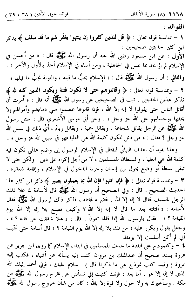 2 - وبمناسبة قوله تعالى: وَقاتِلُوهُمْ حَتَّى لا تَكُونَ فِتْنَةٌ وَيَكُونَ الدِّينُ كُلُّهُ لِلَّهِ نذكر هذين الحديثين: ثبت في الصحيحين عن رسول الله صلى الله عليه وسلم أنه قال: «أمرت أن أقاتل الناس حتى يقولوا لا إله إلا الله، فإذا قالوها عصموا مني دماءهم وأموالهم إلا بحقها، وحسابهم على الله عزّ وجل». وعن أبي موسى الأشعري قال: سئل رسول الله صلى الله عليه وسلم عن الرجل يقاتل شجاعة، ويقاتل حمية، ويقاتل رياء، أي ذلك في سبيل الله عزّ وجل؟ فقال: «من قاتل لتكون كلمة الله هي العليا فهو في