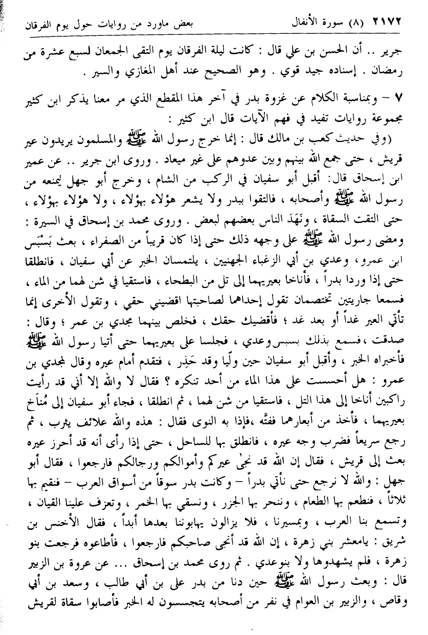 7 - وبمناسبة الكلام عن غزوة بدر في آخر هذا المقطع الذي مر معنا يذكر ابن كثير مجموعة روايات تفيد في فهم الآيات قال ابن كثير: