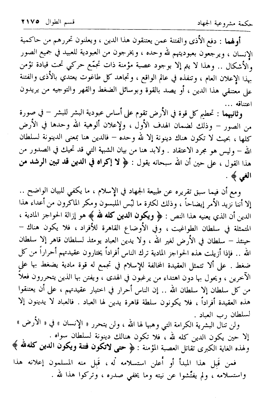 إلا أننا نزيد الأمر إيضاحا، وذلك لكثرة ما لبس الملبسون ومكر الماكرون من أعداء هذا الدين أن الذي يعنيه هذا النص: وَيَكُونَ الدِّينُ كُلُّهُ لِلَّهِ هو إزالة الحواجز المادية، المتمثلة في سلطان الطواغيت، وفي الأوضاع القاهرة للأفراد، فلا يكون هناك- حينئذ- سلطان في الأرض لغير الله، ولا يدين العباد يومئذ لسلطان قاهر إلا سلطان الله .. فإذا أزيلت هذه الحواجز المادية ترك الناس أفرادا يختارون عقيدتهم أحرارا من كل ضغط. على ألا تتمثل العقيدة المخالفة للإسلام في تجمع له قوة مادية يضغط بها على الآخرين، ويحول بها دون اهتداء من يرغبون في الهدى، ويفتن بها الذين يتحررون فعلا من كل سلطان إلا سلطان الله .. إن الناس أحرار في اختيار عقيدتهم، على أن يعتنقوا هذه العقيدة أفرادا، فلا يكونون سلطة قاهرة يدين لها العباد. فالعباد لا يدينون إلا لسلطان رب العباد.