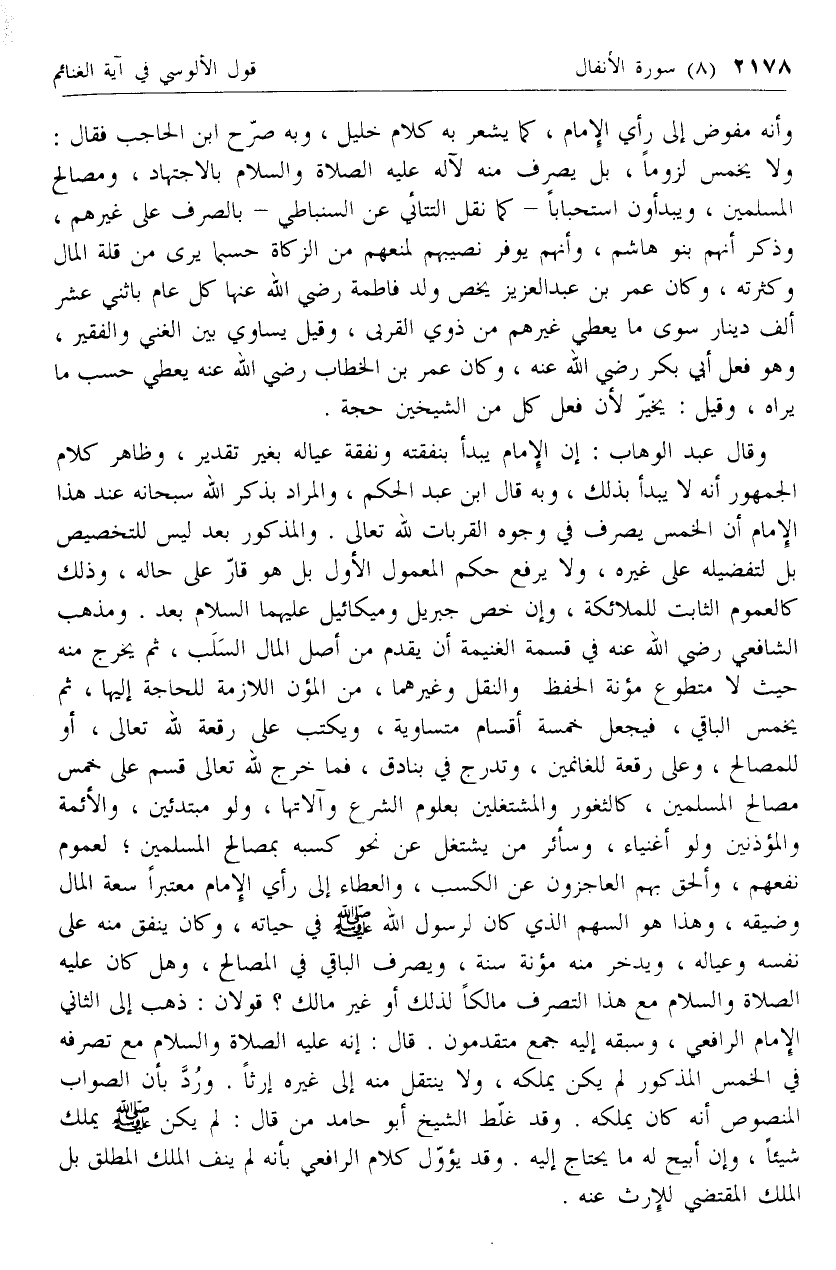 وقال عبد الوهاب: إن الإمام يبدأ بنفقته ونفقة عياله بغير تقدير، وظاهر كلام الجمهور أنه لا يبدأ بذلك، وبه قال ابن عبد الحكم، والمراد بذكر الله سبحانه عند هذا الإمام أن الخمس يصرف في وجوه القربات لله تعالى. والمذكور بعد ليس للتخصيص بل لتفضيله على غيره، ولا يرفع حكم المعمول الأول بل هو قار على حاله، وذلك كالعموم الثابت للملائكة، وإن خص جبريل وميكائيل عليهما السلام بعد. ومذهب الشافعي رضي الله عنه في قسمة الغنيمة أن يقدم من أصل المال السلب، ثم يخرج منه حيث لا متطوع مئونة الحفظ والنقل وغيرهما، من المؤن اللازمة للحاجة إليها، ثم يخمس الباقي، فيجعل خمسة أقسام متساوية، ويكتب على رقعة لله تعالى، أو للمصالح، وعلى رقعة للغانمين، وتدرج في بنادق، فما خرج لله تعالى قسم على خمس مصالح المسلمين، كالثغور والمشتغلين بعلوم الشرع وآلاتها، ولو مبتدءين، والأئمة والمؤذنين ولو أغنياء، وسائر من يشتغل عن نحو كسبه بمصالح المسلمين؛ لعموم نفعهم، وألحق بهم العاجزون عن الكسب، والعطاء إلى رأي الإمام معتبرا سعة المال وضيقه، وهذا هو السهم الذي كان لرسول الله صلى الله عليه وسلم في حياته، وكان ينفق منه على نفسه وعياله، ويدخر منه مئونة سنة، ويصرف الباقي في المصالح، وهل كان عليه الصلاة والسلام مع هذا التصرف مالكا لذلك أو غير مالك؟ قولان: ذهب إلى الثاني الإمام الرافعي، وسبقه إليه جمع متقدمون. قال: إنه عليه الصلاة والسلام مع تصرفه في الخمس المذكور لم يكن يملكه، ولا ينتقل منه إلى غيره إرثا. ورد بأن الصواب المنصوص أنه كان يملكه. وقد غلط الشيخ أبو حامد من قال: لم يكن صلى الله عليه وسلم يملك شيئا، وإن أبيح له ما يحتاج إليه. وقد يؤول كلام الرافعي بأنه لم ينف الملك المطلق بل الملك المقتضي للإرث عنه.