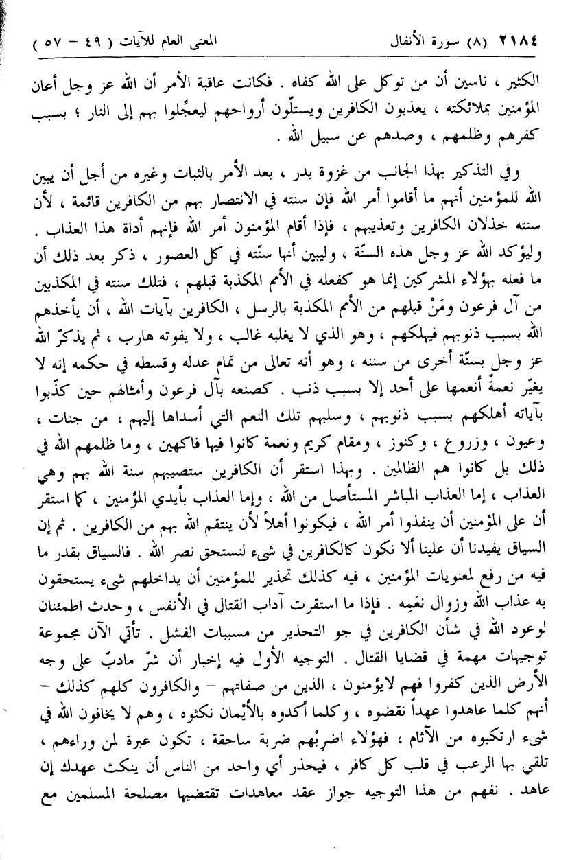 وليؤكد الله عزّ وجل هذه السنة، وليبين أنها سنته في كل العصور، ذكر بعد ذلك أن ما فعله بهؤلاء المشركين إنما هو كفعله في الأمم المكذبة قبلهم، فتلك سنته في المكذبين من آل فرعون ومن قبلهم من الأمم المكذبة بالرسل، الكافرين بآيات الله، أن يأخذهم الله بسبب ذنوبهم فيهلكهم، وهو الذي لا يغلبه غالب، ولا يفوته هارب، ثم يذكر الله عزّ وجل بسنة أخرى من سننه، وهو أنه تعالى من تمام عدله وقسطه في حكمه إنه لا يغير نعمة أنعمها على أحد إلا بسبب ذنب. كصنعه بآل فرعون وأمثالهم حين كذبوا بآياته أهلكهم بسبب ذنوبهم، وسلبهم تلك النعم التي أسداها إليهم، من جنات، وعيون، وزروع، وكنوز، ومقام كريم ونعمة كانوا فيها فاكهين، وما ظلمهم الله في ذلك بل كانوا هم الظالمين. وبهذا استقر أن الكافرين ستصيبهم سنة الله بهم وهي العذاب، إما العذاب المباشر المستأصل من الله، وإما العذاب بأيدي المؤمنين، كما استقر أن على المؤمنين أن ينفذوا أمر الله، فيكونوا أهلا لأن ينتقم الله بهم من الكافرين. ثم إن السياق يفيدنا أن علينا ألا نكون كالكافرين في شئ لنستحق نصر الله. فالسياق بقدر ما فيه من رفع لمعنويات المؤمنين، فيه كذلك تحذير للمؤمنين أن يداخلهم شئ يستحقون به عذاب الله وزوال نعمه. فإذا ما استقرت آداب القتال في الأنفس، وحدث اطمئنان لوعود الله في شأن الكافرين في جو التحذير من مسببات الفشل. تأتي الآن مجموعة توجيهات مهمة في قضايا القتال. التوجيه الأول فيه إخبار أن شر ما دب على وجه الأرض الذين كفروا فهم لا يؤمنون، الذين من صفاتهم- والكافرون كلهم كذلك- أنهم كلما عاهدوا عهدا نقضوه، وكلما أكدوه بالأيمان نكثوه، وهم لا يخافون الله في شئ ارتكبوه من الآثام، فهؤلاء اضربهم ضربة ساحقة، تكون عبرة لمن وراءهم، تلقي بها الرعب في قلب كل كافر، فيحذر أي واحد من الناس أن ينكث عهدك إن عاهد. نفهم من هذا التوجيه جواز عقد معاهدات تقتضيها مصلحة المسلمين مع