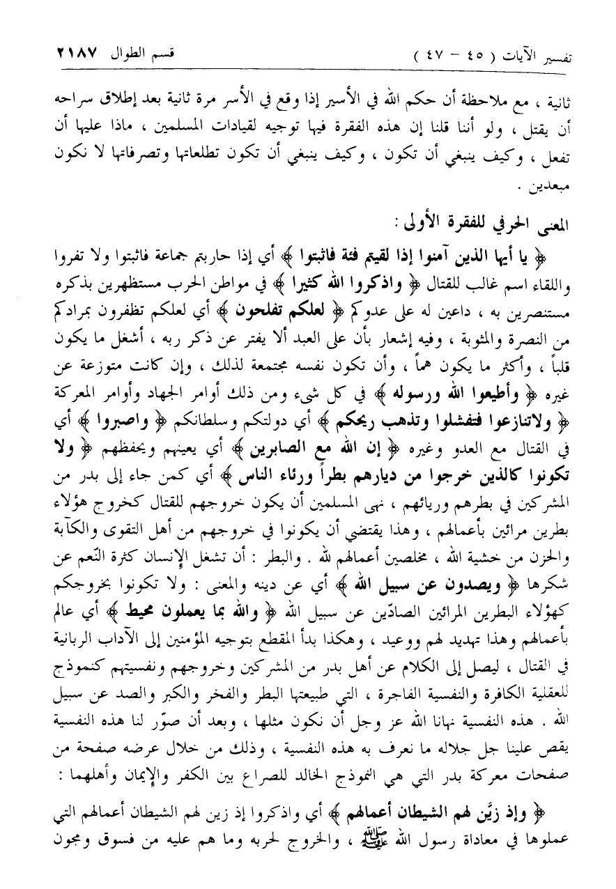يا أَيُّهَا الَّذِينَ آمَنُوا إِذا لَقِيتُمْ فِئَةً فَاثْبُتُوا أي إذا حاربتم جماعة فاثبتوا ولا تفروا واللقاء اسم غالب للقتال وَاذْكُرُوا اللَّهَ كَثِيراً في مواطن الحرب مستظهرين بذكره مستنصرين به، داعين له على عدوكم لَعَلَّكُمْ تُفْلِحُونَ أي لعلكم تظفرون بمرادكم من النصرة والمثوبة، وفيه إشعار بأن على العبد ألا يفتر عن ذكر ربه، أشغل ما يكون قلبا، وأكثر ما يكون هما، وأن تكون نفسه مجتمعة لذلك، وإن كانت متوزعة عن غيره