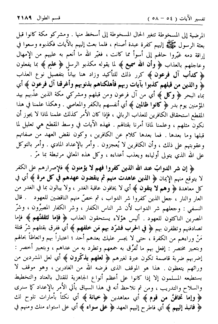 كَدَأْبِ آلِ فِرْعَوْنَ كرر ذلك للتأكيد وزاد هنا بيانا بتفصيل نوع العذاب وَالَّذِينَ مِنْ قَبْلِهِمْ كَذَّبُوا بِآياتِ رَبِّهِمْ فَأَهْلَكْناهُمْ بِذُنُوبِهِمْ وَأَغْرَقْنا آلَ فِرْعَوْنَ أي بماء البحر وَكُلٌّ أي من آل فرعون ومن قبلهم ومشركي مكة الذين عذبهم بيد المؤمنين يوم بدر كانُوا ظالِمِينَ أي أنفسهم بالكفر والمعاصي. وهكذا علمنا في هذا المقطع استحقاق الكافرين للعذاب الرباني، فإذا كان الأمر كذلك علمنا لماذا لا يجوز أن نكون مثلهم، وعلمنا لماذا أمرنا بقتالهم. فهذه الآيات في وسط المقطع هي تعليل لما قبلها وما بعدها. فما بعدها كلام عن الكافرين، وكون نقض العهد من صفاتهم وعقوبتهم على ذلك، وأن الكافرين لا يعجزون. وأمر بالإعداد المادي. وأمر بالتوكل على الله الذي يتولى أولياءه ويعذب أعداءه، وكل هذه المعاني مرتبطة بما مر.