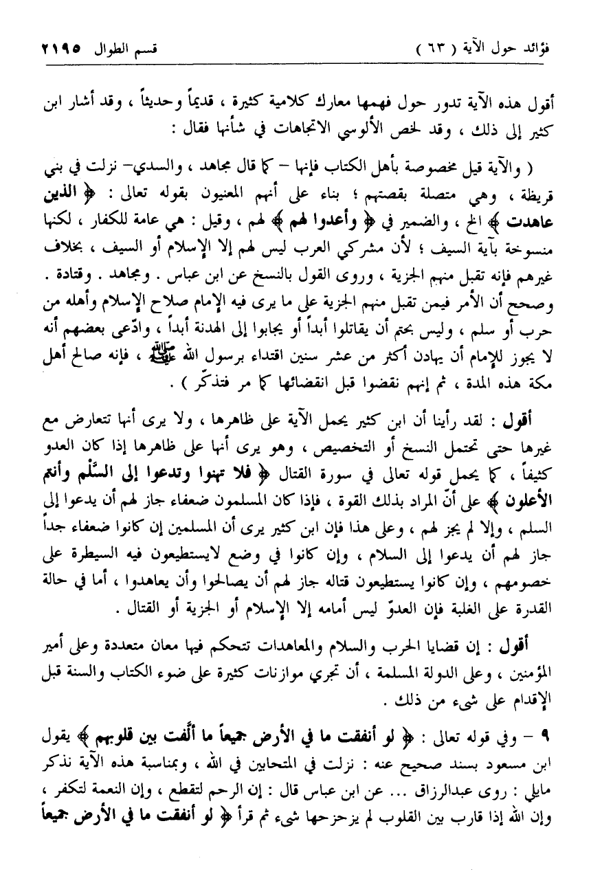 أقول: لقد رأينا أن ابن كثير يحمل الآية على ظاهرها، ولا يرى أنها تتعارض مع غيرها حتى تحتمل النسخ أو التخصيص، وهو يرى أنها على ظاهرها إذا كان العدو كثيفا، كما يحمل قوله تعالى في سورة القتال فَلا تَهِنُوا وَتَدْعُوا إِلَى السَّلْمِ وَأَنْتُمُ الْأَعْلَوْنَ على أن المراد بذلك القوة، فإذا كان المسلمون ضعفاء جاز لهم أن يدعوا إلى السلم، وإلا لم يجز لهم، وعلى هذا فإن ابن كثير يرى أن المسلمين إن كانوا ضعفاء جدا جاز لهم أن يدعوا إلى السلام، وإن كانوا في وضع لا يستطيعون فيه السيطرة على خصومهم، وإن كانوا يستطيعون قتاله جاز لهم أن يصالحوا وأن يعاهدوا، أما في حالة القدرة على الغلبة فإن العدو ليس أمامه إلا الإسلام أو الجزية أو القتال.
