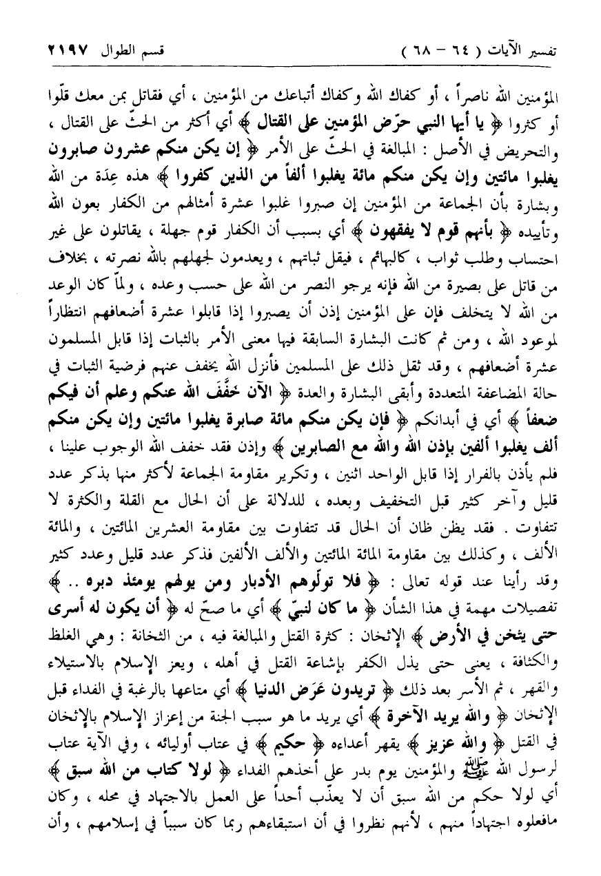 يا أَيُّهَا النَّبِيُّ حَرِّضِ الْمُؤْمِنِينَ عَلَى الْقِتالِ أي أكثر من الحث على القتال، والتحريض في الأصل: المبالغة في الحث على الأمر إِنْ يَكُنْ مِنْكُمْ عِشْرُونَ صابِرُونَ يَغْلِبُوا مِائَتَيْنِ وَإِنْ يَكُنْ مِنْكُمْ مِائَةٌ يَغْلِبُوا أَلْفاً مِنَ الَّذِينَ كَفَرُوا هذه عدة من الله وبشارة بأن الجماعة من المؤمنين إن صبروا غلبوا عشرة أمثالهم من الكفار بعون الله وتأييده بِأَنَّهُمْ قَوْمٌ لا يَفْقَهُونَ أي بسبب أن الكفار قوم جهلة، يقاتلون على غير احتساب وطلب ثواب، كالبهائم، فيقل ثباتهم، ويعدمون لجهلهم بالله نصرته، بخلاف من قاتل على بصيرة من الله فإنه يرجو النصر من الله على حسب وعده، ولما كان الوعد من الله لا يتخلف فإن على المؤمنين إذن أن يصبروا إذا قابلوا عشرة أضعافهم انتظارا لموعود الله، ومن ثم كانت البشارة السابقة فيها معنى الأمر بالثبات إذا قابل المسلمون عشرة أضعافهم،