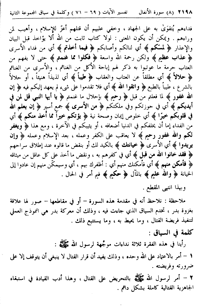 ملاحظة: نلاحظ أنه في مقدمة هذه السورة- أو في مقاطعها- صور لها علاقة بغزوة بدر، تخدم السياق الذي جاءت فيه، وذلك أن معركة بدر هي النموذج العملي لتنفيذ فريضة القتال، وما يحيط به، وما يستتبع ذلك.