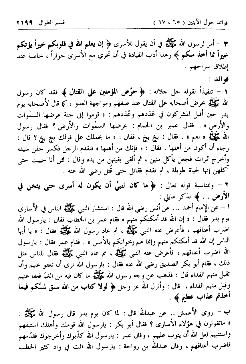 2 - وبمناسبة قوله تعالى: ما كانَ لِنَبِيٍّ أَنْ يَكُونَ لَهُ أَسْرى حَتَّى يُثْخِنَ فِي الْأَرْضِ ... نذكر ما يلي:
