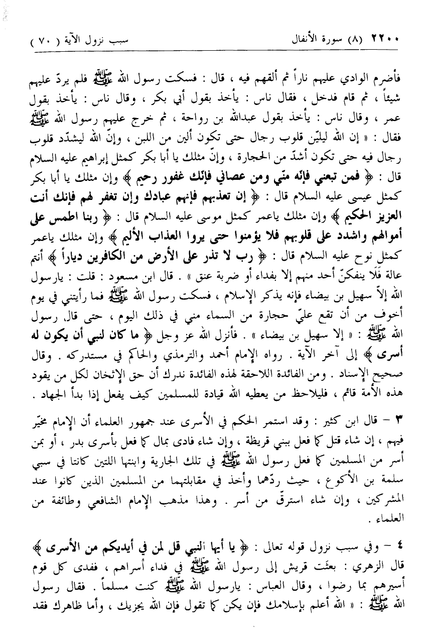 فأضرم الوادي عليهم نارا ثم ألقهم فيه، قال: فسكت رسول الله صلى الله عليه وسلم فلم يرد عليهم شيئا، ثم قام فدخل، فقال ناس: يأخذ بقول أبي بكر، وقال ناس: يأخذ بقول عمر، وقال ناس: يأخذ بقول عبد الله بن رواحة، ثم خرج عليهم رسول الله صلى الله عليه وسلم فقال: «إن الله ليلين قلوب رجال حتى تكون ألين من اللبن، وإن الله ليشدد قلوب رجال فيه حتى تكون أشد من الحجارة، وإن مثلك يا أبا بكر كمثل إبراهيم عليه السلام قال: فَمَنْ تَبِعَنِي فَإِنَّهُ مِنِّي وَمَنْ عَصانِي فَإِنَّكَ غَفُورٌ رَحِيمٌ وإن مثلك يا أبا بكر كمثل عيسى عليه السلام قال: إِنْ تُعَذِّبْهُمْ فَإِنَّهُمْ عِبادُكَ وَإِنْ تَغْفِرْ لَهُمْ فَإِنَّكَ أَنْتَ الْعَزِيزُ الْحَكِيمُ وإن مثلك يا عمر كمثل موسى عليه السلام قال: رَبَّنَا اطْمِسْ عَلى أَمْوالِهِمْ وَاشْدُدْ عَلى قُلُوبِهِمْ فَلا يُؤْمِنُوا حَتَّى يَرَوُا الْعَذابَ الْأَلِيمَ وإن مثلك يا عمر كمثل نوح عليه السلام قال: رَبِّ لا تَذَرْ عَلَى الْأَرْضِ مِنَ الْكافِرِينَ دَيَّاراً أنتم عالة فلا ينفكن أحد منهم إلا بفداء أو ضربة عنق». قال ابن مسعود: قلت: يا رسول الله إلا سهيل بن بيضاء فإنه يذكر الإسلام، فسكت رسول الله صلى الله عليه وسلم فما رأيتني في يوم أخوف من أن تقع علي حجارة من السماء مني في ذلك اليوم، حتى قال رسول الله صلى الله عليه وسلم: «إلا سهيل بن بيضاء». فأنزل الله عزّ وجل ما كانَ لِنَبِيٍّ أَنْ يَكُونَ لَهُ أَسْرى إلى آخر الآية. رواه الإمام أحمد والترمذي والحاكم في مستدركه. وقال صحيح الإسناد. ومن الفائدة اللاحقة لهذه الفائدة ندرك أن حق الإثخان لكل من يقود هذه الأمة قائم، فليلاحظ من يعطيه الله قيادة للمسلمين كيف يفعل إذا بدأ الجهاد.