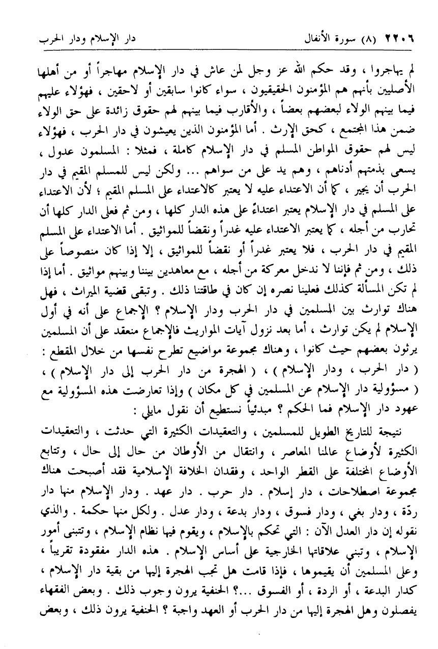 (دار الحرب، ودار الإسلام)، (الهجرة من دار الحرب إلى دار الإسلام)، (مسئولية دار الإسلام عن المسلمين في كل مكان) وإذا تعارضت هذه المسئولية مع عهود دار الإسلام فما الحكم؟ مبدئيا نستطيع أن نقول ما يلي: