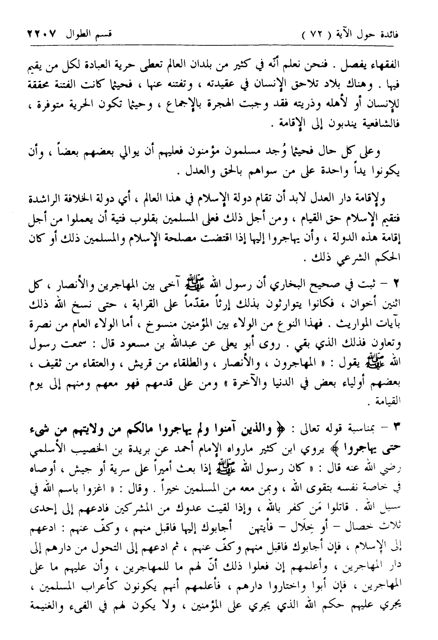 3 - بمناسبة قوله تعالى: وَالَّذِينَ آمَنُوا وَلَمْ يُهاجِرُوا ما لَكُمْ مِنْ وَلايَتِهِمْ مِنْ شَيْءٍ حَتَّى يُهاجِرُوا يروي ابن كثير ما رواه الإمام أحمد عن بريدة بن الخصيب الأسلمي رضي الله عنه قال: «كان رسول الله صلى الله عليه وسلم إذا بعث أميرا على سرية أو جيش، أوصاه في خاصة نفسه بتقوى الله، وبمن معه من المسلمين خيرا. وقال: «اغزوا باسم الله في سبيل الله. قاتلوا من كفر بالله، وإذا لقيت عدوك من المشركين فادعهم إلى إحدى ثلاث خصال- أو خلال- فأيتهن أجابوك إليها فاقبل منهم، وكف عنهم: ادعهم إلى الإسلام، فإن أجابوك فاقبل منهم وكف عنهم، ثم ادعهم إلى التحول من دارهم إلى دار المهاجرين، وأعلمهم إن فعلوا ذلك أن لهم ما للمهاجرين، وأن عليهم ما على المهاجرين، فإن أبوا واختاروا دارهم، فأعلمهم أنهم يكونون كأعراب المسلمين، يجري عليهم حكم الله الذي يجري على المؤمنين، ولا يكون لهم في الفئ والغنيمة