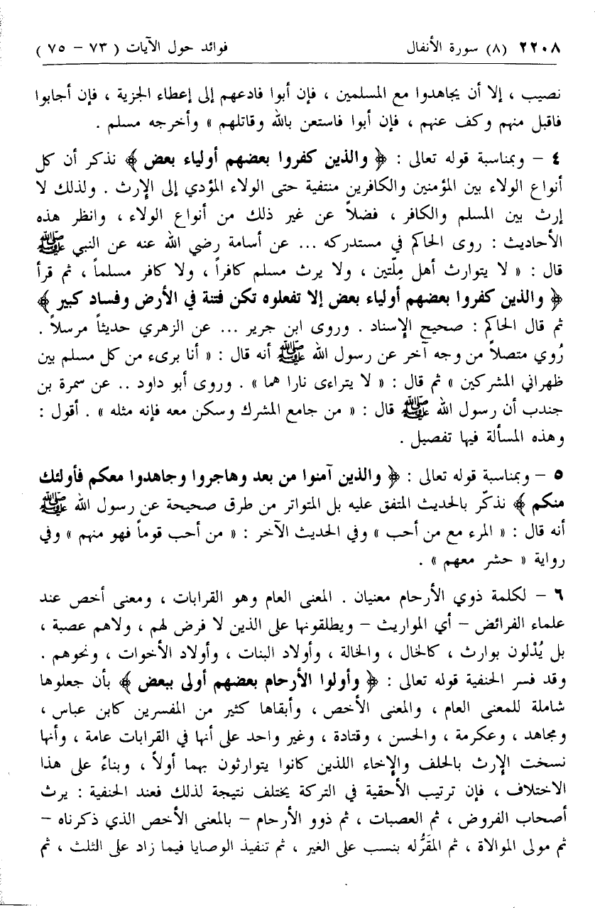 4 - وبمناسبة قوله تعالى: وَالَّذِينَ كَفَرُوا بَعْضُهُمْ أَوْلِياءُ بَعْضٍ نذكر أن كل أنواع الولاء بين المؤمنين والكافرين منتفية حتى الولاء المؤدي إلى الإرث. ولذلك لا إرث بين المسلم والكافر، فضلا عن غير ذلك من أنواع الولاء، وانظر هذه الأحاديث: روى الحاكم في مستدركه ... عن أسامة رضي الله عنه عن النبي صلى الله عليه وسلم قال: «لا يتوارث أهل ملتين، ولا يرث مسلم كافرا، ولا كافر مسلما، ثم قرأ وَالَّذِينَ كَفَرُوا بَعْضُهُمْ أَوْلِياءُ بَعْضٍ إِلَّا تَفْعَلُوهُ تَكُنْ فِتْنَةٌ فِي الْأَرْضِ وَفَسادٌ كَبِيرٌ ثم قال الحاكم: صحيح الإسناد. وروى ابن جرير ... عن الزهري حديثا مرسلا.