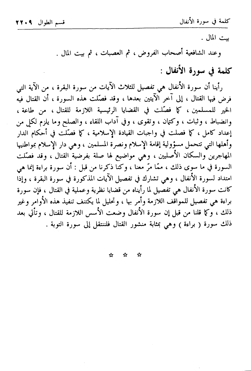 رأينا أن سورة الأنفال هي تفصيل للثلاث الآيات من سورة البقرة، من الآية التي فرض فيها القتال، إلى آخر الآيتين بعدها، وقد فصلت هذه السورة، أن القتال فيه الخير للمسلمين، كما فصلت في القضايا الرئيسية اللازمة للقتال، من طاعة، وانضباط، وثبات، وكتمان، وتقوى، وفي آداب اللقاء، والصلح وما يلزم لكل من إعداد كامل، كما فصلت في واجبات القيادة الإسلامية، كما فصلت في أحكام الدار وأهلها التي تتحمل مسئولية إقامة الإسلام ونصرة المسلمين، وهي دار الإسلام بمواطنيها المهاجرين والسكان الأصليين، وهي مواضيع لها صلة بفرضية القتال، وقد فصلت السورة في ما سوى ذلك، مما مر معنا، وكنا ذكرنا من قبل: أن سورة براءة إنما هي امتداد لسورة الأنفال، وهي تشارك في تفصيل الآيات المذكورة في سورة البقرة، وإذا كانت سورة الأنفال هي تفصيل لما رأيناه من قضايا نظرية وعملية في القتال، فإن سورة براءة هي تفصيل للمواقف اللازمة وأمر بها، وتحليل لما يكتنف تنفيذ هذه الأوامر وغير ذلك، وكما قلنا من قبل إن سورة الأنفال وضعت الأسس اللازمة للقتال، وتأتي بعد ذلك سورة (براءة) وهي بمثابة منشور القتال فلننتقل إلى سورة التوبة.