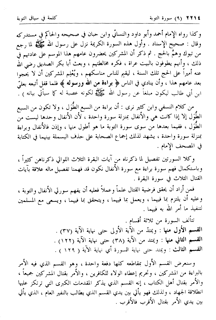 وسنعرض القسم الأول بمقاطعه كلها دفعة واحدة، وهو القسم الذي فيه الأمر بالبراءة من المشركين، وتحريم إعطاء الولاء للكافرين، والأمر بقتال المشركين جميعا، والأمر بقتال أهل الكتاب، إنه القسم الذي يذكر المقدمات الكبرى التي ترتكز عليها انطلاقة الجهاد، ولذلك فهو يأتي بين يدي القسم الذي يطالب بالنفير العام، الذي يأتي بين يدي الأمر بقتال الأقرب فالأقرب.