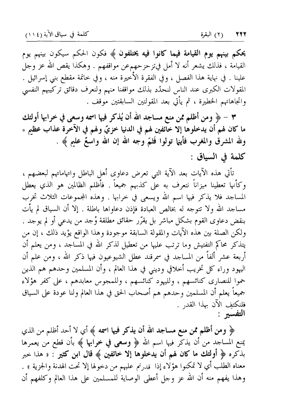 تأتي هذه الآيات بعد الآية التي تعرض دعاوى أهل الباطل واتهاماتهم لبعضهم، وكأنها تعطينا ميزانا نتعرف به على كذبهم جميعا. فأظلم الظالمين هو الذي يعطل المساجد فلا يذكر فيها اسم الله ويسعى في خرابها. وهذه المجموعات الثلاث تخرب مساجد الله ولا تتوجه له بخالص العبادة فإذن دعاواها باطلة. إلا أن السياق لم يأت بنقض دعاوى القوم بشكل مباشر بل يقرر حقائق مطلقة وجد من يدعي أو لم يوجد.