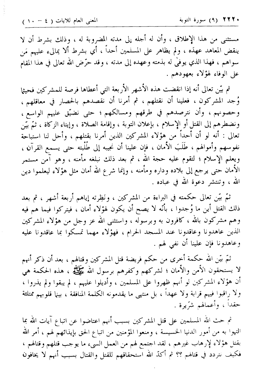 ثم بين تعالى أنه إذا انقضت هذه الأشهر الأربعة التي أعطاها فرصة للمشركين فحيثما وجد المشركون، فعلينا أن نقتلهم، ثم أمرنا أن نقصدهم بالحصار في معاقلهم، وحصونهم، وأن نترصدهم في طرقهم ومسالكهم؛ حتى نضيق عليهم الواسع، ونضطرهم إلى القتل أو الإسلام، بإعلان التوبة، وإقامة الصلاة، وإيتاء الزكاة، ثم بين تعالى: أنه لو أن أحدا من هؤلاء المشركين الذين أمرنا بقتلهم، وأحل لنا استباحة نفوسهم وأموالهم، طلب الأمان، فإن علينا أن نجيبه إلى طلبته حتى يسمع القرآن، ويعلم الإسلام؛ لتقوم عليه حجة الله، ثم بعد ذلك نبلغه مأمنه، وهو آمن مستمر الأمان حتى يرجع إلى بلاده وداره ومأمنه، وإنما شرع الله أمان مثل هؤلاء ليعلموا دين الله،