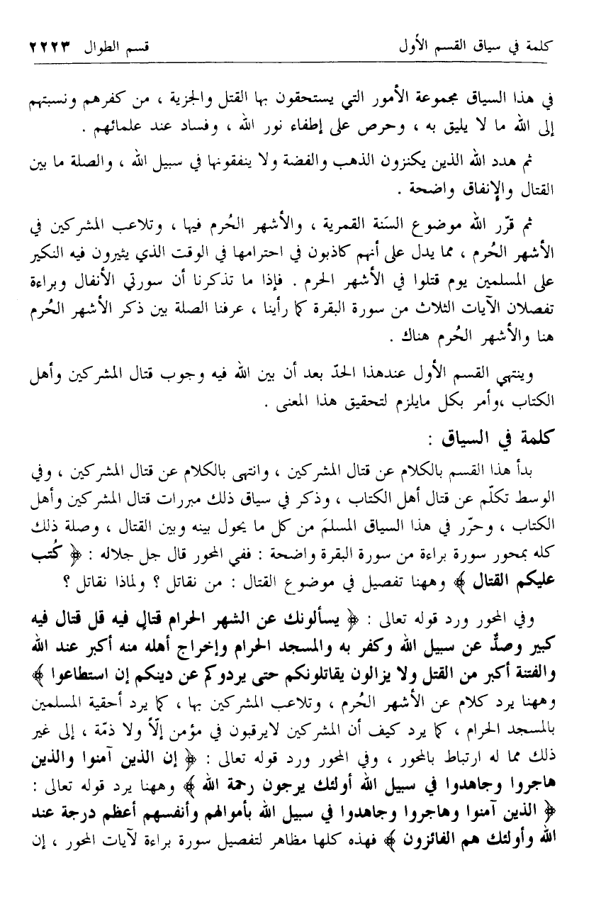 بدأ هذا القسم بالكلام عن قتال المشركين، وانتهى بالكلام عن قتال المشركين، وفي الوسط تكلم عن قتال أهل الكتاب، وذكر في سياق ذلك مبررات قتال المشركين وأهل الكتاب، وحرر في هذا السياق المسلم من كل ما يحول بينه وبين القتال، وصلة ذلك كله بمحور سورة براءة من سورة البقرة واضحة: ففي المحور قال جل جلاله: كُتِبَ عَلَيْكُمُ الْقِتالُ* وهاهنا تفصيل في موضوع القتال: من نقاتل؟ ولماذا نقاتل؟