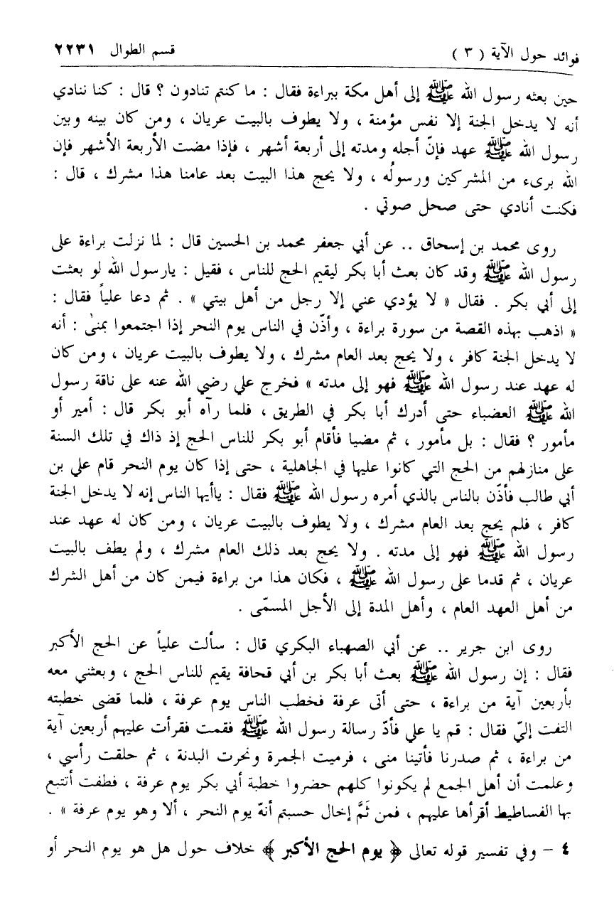 روى ابن جرير .. عن أبي الصهباء البكري قال: سألت عليا عن الحج الأكبر فقال: إن رسول الله صلى الله عليه وسلم بعث أبا بكر بن أبي قحافة يقيم للناس الحج، وبعثني معه بأربعين آية من براءة، حتى أتى عرفة فخطب الناس يوم عرفة، فلما قضى خطبته التفت إلي فقال: قم يا علي فأد رسالة رسول الله صلى الله عليه وسلم فقمت فقرأت عليهم أربعين آية من براءة، ثم صدرنا فأتينا منى، فرميت الجمرة ونحرت البدنة، ثم حلقت رأسي، وعلمت أن أهل الجمع لم يكونوا كلهم حضروا خطبة أبي بكر يوم عرفة، فطفت أتتبع بها الفساطيط أقرأها عليهم، فمن ثم إخال حسبتم أنه يوم النحر، ألا وهو يوم عرفة».