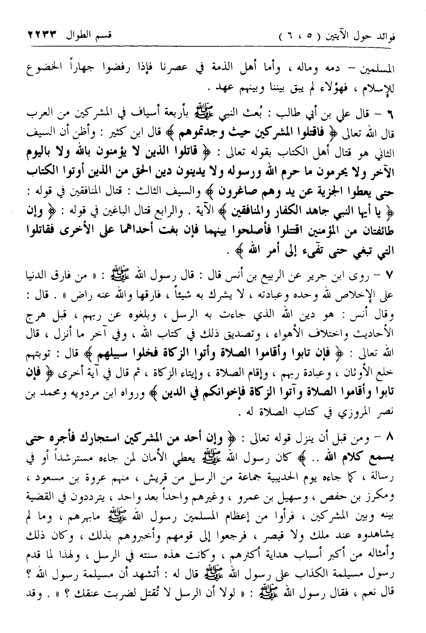 6 - قال علي بن أبي طالب: بعث النبي صلى الله عليه وسلم بأربعة أسياف في المشركين من العرب قال الله تعالى فَاقْتُلُوا الْمُشْرِكِينَ حَيْثُ وَجَدْتُمُوهُمْ قال ابن كثير: وأظن أن السيف الثاني هو قتال أهل الكتاب بقوله تعالى: قاتِلُوا الَّذِينَ لا يُؤْمِنُونَ بِاللَّهِ وَلا بِالْيَوْمِ الْآخِرِ وَلا يُحَرِّمُونَ ما حَرَّمَ اللَّهُ وَرَسُولُهُ وَلا يَدِينُونَ دِينَ الْحَقِّ مِنَ الَّذِينَ أُوتُوا الْكِتابَ حَتَّى يُعْطُوا الْجِزْيَةَ عَنْ يَدٍ وَهُمْ صاغِرُونَ والسيف الثالث: قتال المنافقين في قوله: