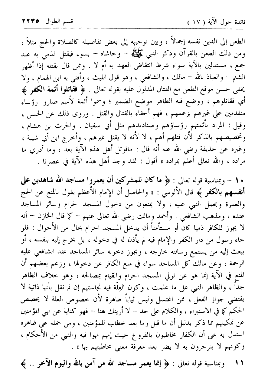 الطعن إلى الدين نفسه إجمالا، وبين توجيهه إلى بعض تفاصيله كالصلاة والحج مثلا، ومن ذلك الطعن بالقرآن وذكر النبي صلى الله عليه وسلم- وحاشاه- بسوء فيقتل الذمي به عند جمع، مستدلين بالآية سواء شرط انتقاض العهد به أم لا. وممن قال بقتله إذا أظهر الشتم- والعياذ بالله- مالك، والشافعي، وهو قول الليث، وأفتى به ابن الهمام، ولا يخفى حسن موقع الطعن مع القتال المدلول عليه بقوله تعالى. فَقاتِلُوا أَئِمَّةَ الْكُفْرِ أي فقاتلوهم، ووضع فيه الظاهر موضع الضمير؛ وسموا أئمة لأنهم صاروا رؤساء متقدمين على غيرهم بزعمهم، فهم أحقاء بالقتال والقتل. وروى ذلك عن الحسن، وقيل: المراد بأئمتهم رؤساؤهم وصناديدهم مثل أبي سفيان. والحرث بن هشام، وتخصيصهم بالذكر لأن قتلهم أهم، لا لأنه لا يقتل غيرهم، وأخرج ابن أبي شيبة، وغيره عن حذيفة رضي الله عنه أنه قال: ما قوتل أهل هذه الآية بعد، وما أدري ما مراده، والله تعالى أعلم بمراده» أقول: لقد وجد أهل هذه الآية في عصرنا.