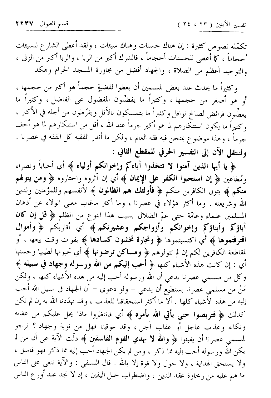 قُلْ إِنْ كانَ آباؤُكُمْ وَأَبْناؤُكُمْ وَإِخْوانُكُمْ وَأَزْواجُكُمْ وَعَشِيرَتُكُمْ أي أقاربكم وَأَمْوالٌ اقْتَرَفْتُمُوها أي اكتسبتموها وَتِجارَةٌ تَخْشَوْنَ كَسادَها بفوات وقت بيعها، أو لمقاطعة الكافرين لكم إن لم تتولوهم وَمَساكِنُ تَرْضَوْنَها أي تحبونها لطيبها وحسنها أي: إن كانت هذه الأشياء كلها أَحَبَّ إِلَيْكُمْ مِنَ اللَّهِ وَرَسُولِهِ وَجِهادٍ فِي سَبِيلِهِ وكل من مسلمي عصرنا يدعي أن الله ورسوله أحب إليه من هذه الأشياء كلها، ولكن من من مسلمي عصرنا يستطيع أن يدعي- ولو دعوى- أن الجهاد في سبيل الله أحب إليه من هذه الأشياء كلها. ألا ما أكثر استحقاقنا للعذاب، وقد تهددنا الله به إن لم نكن كذلك فَتَرَبَّصُوا حَتَّى يَأْتِيَ اللَّهُ بِأَمْرِهِ أي فانتظروا ماذا يحل عليكم من عقابه ونكاله وعذاب عاجل أو عقاب آجل، وقد عوقبنا فهل من توبة وجهاد؟ نرجو لمسلمي عصرنا أن يفيئوا وَاللَّهُ لا يَهْدِي الْقَوْمَ الْفاسِقِينَ دلت الآية على أن من لم يكن الله ورسوله أحب إليه مما ذكر، ومن لم يكن الجهاد أحب إليه مما ذكر فهو فاسق، ولا يستحق الهداية، ولا حول ولا قوة إلا بالله. قال النسفي: والآية تنعى على الناس ما هم عليه من رخاوة عقد الدين، واضطراب حبل اليقين، إذ لا تجد عند أورع الناس