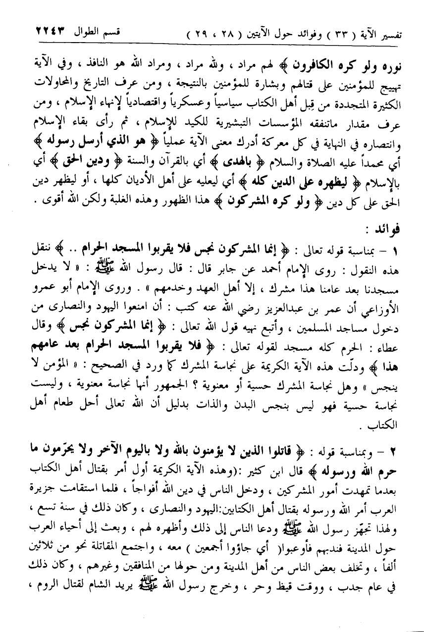2 - وبمناسبة قوله: قاتِلُوا الَّذِينَ لا يُؤْمِنُونَ بِاللَّهِ وَلا بِالْيَوْمِ الْآخِرِ وَلا يُحَرِّمُونَ ما حَرَّمَ اللَّهُ وَرَسُولُهُ قال ابن كثير: (وهذه الآية الكريمة أول أمر بقتال أهل الكتاب بعد ما تمهدت أمور المشركين، ودخل الناس في دين الله أفواجا، فلما استقامت جزيرة العرب أمر الله ورسوله بقتال أهل الكتابين: اليهود والنصارى، وكان ذلك في سنة تسع، ولهذا تجهز رسول الله صلى الله عليه وسلم ودعا الناس إلى ذلك وأظهره لهم، وبعث إلى أحياء العرب حول المدينة فندبهم فأوعبوا (أي جاءوا أجمعين) معه،