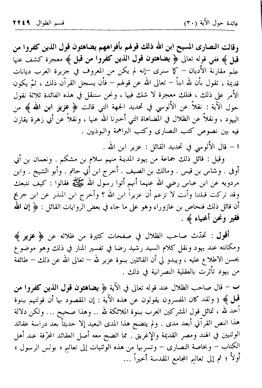 وَقالَتِ النَّصارى الْمَسِيحُ ابْنُ اللَّهِ ذلِكَ قَوْلُهُمْ بِأَفْواهِهِمْ يُضاهِؤُنَ قَوْلَ الَّذِينَ كَفَرُوا مِنْ قَبْلُ ففي قوله تعالى يُضاهِؤُنَ قَوْلَ الَّذِينَ كَفَرُوا مِنْ قَبْلُ معجزة كشف عنها علم مقارنة الأديان- كما سنرى- إنه لم يكن من المعروف في جزيرة العرب ديانات قديمة، تقول بأن لله ابنا- تعالى الله عن قولهم- فإن يسجل القرآن ذلك، ثم يكون الأمر على ذلك، فتلك معجزة لا شك فيها، ونحن سننقل في هذه الفائدة ثلاثة نقول حول الآية: نقلا عن الألوسي في تحديد الجهة التي قالت عُزَيْرٌ ابْنُ اللَّهِ من اليهود، ونقلا عن الظلال في المضاهاة التي أخبرنا الله عنها، ونقلا عن أبي زهرة يقارن فيه بين نصوص كتب النصارى وكتب البراهمة والبوذيين.