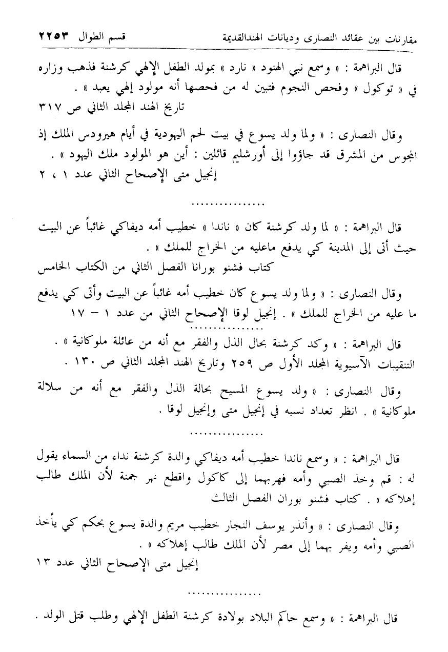 قال البراهمة: «وسمع نبي الهنود «نارد» بمولد الطفل الإلهي كرشنة فذهب وزاره في «توكول» وفحص النجوم فتبين له من فحصها أنه مولود إلهي يعبد».