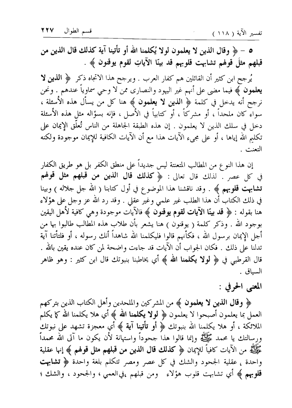 وَقالَ الَّذِينَ لا يَعْلَمُونَ من المشركين والملحدين وأهل الكتاب الذين بتركهم العمل بما يعلمون أصبحوا لا يعلمون لَوْلا يُكَلِّمُنَا اللَّهُ أي هلا يكلمنا الله كما يكلم الملائكة، أو هلا يكلمنا الله بنبوتك أَوْ تَأْتِينا آيَةٌ أي معجزة تشهد على نبوتك ورسالتك يا محمد صلى الله عليه وسلم وإنما قالوا هذا جحودا واستهانة لأن يكون ما آتى الله محمدا صلى الله عليه وسلم من الآيات كافيا للإيمان كَذلِكَ قالَ الَّذِينَ مِنْ قَبْلِهِمْ مِثْلَ قَوْلِهِمْ إنها عقلية واحدة، عقلية الجحود والشك في كل عصر ومصر تتكلم بلغة واحدة تَشابَهَتْ قُلُوبُهُمْ أي تشابهت قلوب هؤلاء ومن قبلهم، في العمي، والجحود، والشك؛