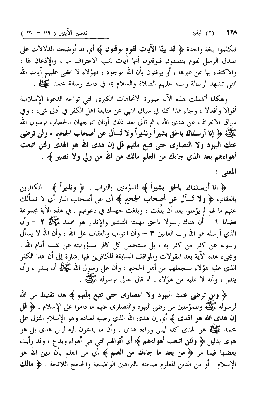 وهكذا أكملت هذه الآية صورة الاتجاهات الكبرى التي تواجه الدعوة الإسلامية أقوالا وأفعالا، وجاء هذا كله في سياق النهي عن متابعة أهل الكفر في أدنى شئ، وفي سياق الانحراف عن هدى الله، ثم تأتي بعد ذلك آيتان تتوجهان بالخطاب لرسول الله صلى الله عليه وسلم إِنَّا أَرْسَلْناكَ بِالْحَقِّ بَشِيراً وَنَذِيراً وَلا تُسْئَلُ عَنْ أَصْحابِ