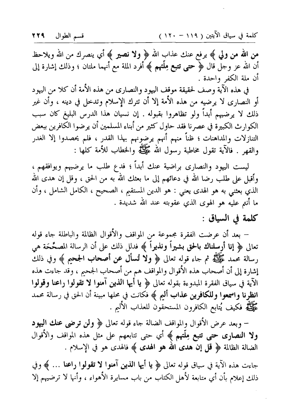 مِنَ اللَّهِ مِنْ وَلِيٍّ يرفع عنك عذاب الله وَلا نَصِيرٍ أي ينصرك من الله ويلاحظ أن الله عزّ وجل قال حَتَّى تَتَّبِعَ مِلَّتَهُمْ أفرد الملة مع أنهما ملتان؛ وذلك إشارة إلى أن ملة الكفر واحدة.