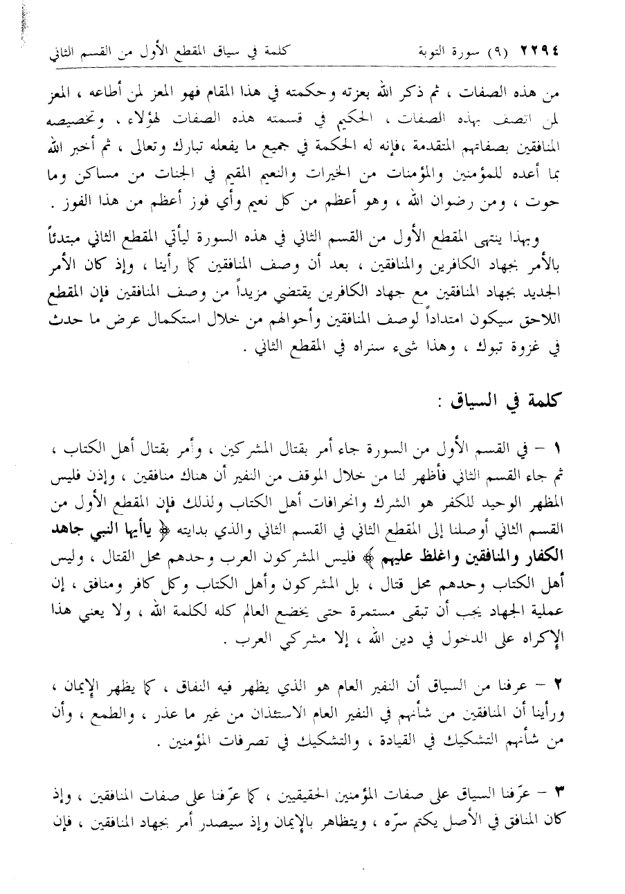 1 - في القسم الأول من السورة جاء أمر بقتال المشركين، وأمر بقتال أهل الكتاب، ثم جاء القسم الثاني فأظهر لنا من خلال الموقف من النفير أن هناك منافقين، وإذن فليس المظهر الوحيد للكفر هو الشرك وانحرافات أهل الكتاب ولذلك فإن المقطع الأول من القسم الثاني أوصلنا إلى المقطع الثاني في القسم الثاني والذي بدايته يا