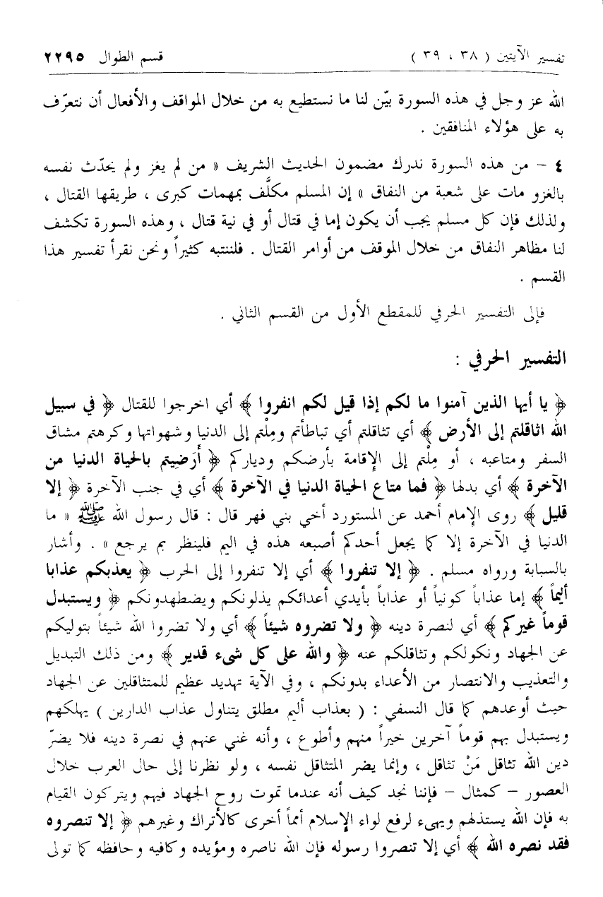 يا أَيُّهَا الَّذِينَ آمَنُوا ما لَكُمْ إِذا قِيلَ لَكُمُ انْفِرُوا أي اخرجوا للقتال فِي سَبِيلِ اللَّهِ اثَّاقَلْتُمْ إِلَى الْأَرْضِ أي تثاقلتم أي تباطأتم وملتم إلى الدنيا وشهواتها وكرهتم مشاق السفر ومتاعبه، أو ملتم إلى الإقامة بأرضكم ودياركم أَرَضِيتُمْ بِالْحَياةِ الدُّنْيا مِنَ الْآخِرَةِ أي بدلها فَما مَتاعُ الْحَياةِ الدُّنْيا فِي الْآخِرَةِ أي في جنب الآخرة إِلَّا قَلِيلٌ روى الإمام أحمد عن المستورد أخي بني فهر قال: قال رسول الله صلى الله عليه وسلم «ما الدنيا في الآخرة إلا كما يجعل أحدكم إصبعه هذه في اليم فلينظر بم يرجع». وأشار بالسبابة ورواه مسلم.