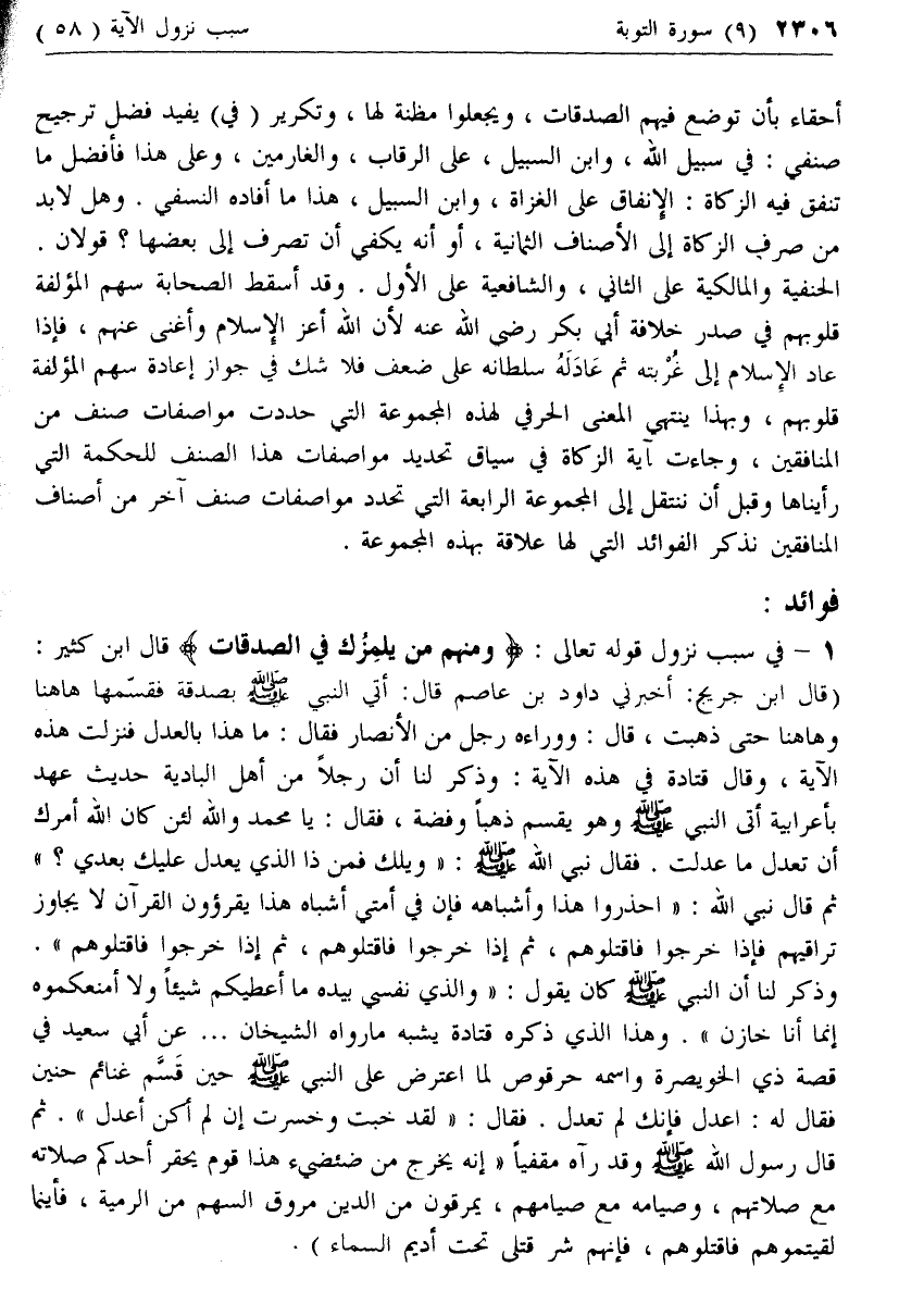 (قال ابن جريج: أخبرني داود بن عاصم قال: أتي النبي صلى الله عليه وسلم بصدقة فقسمها هاهنا وهاهنا حتى ذهبت، قال: ووراءه رجل من الأنصار فقال: ما هذا بالعدل فنزلت هذه الآية، وقال قتادة في هذه الآية: وذكر لنا أن رجلا من أهل البادية حديث عهد بأعرابية أتى النبي صلى الله عليه وسلم وهو يقسم ذهبا وفضة، فقال: يا محمد والله لئن كان الله أمرك أن تعدل ما عدلت. فقال نبي الله صلى الله عليه وسلم: «ويلك فمن ذا الذي يعدل عليك بعدي؟» ثم قال نبي الله: «احذروا هذا وأشباهه فإن في أمتي أشباه هذا يقرءون القرآن لا يجاوز تراقيهم فإذا خرجوا فاقتلوهم، ثم إذا خرجوا فاقتلوهم، ثم إذا خرجوا فاقتلوهم».