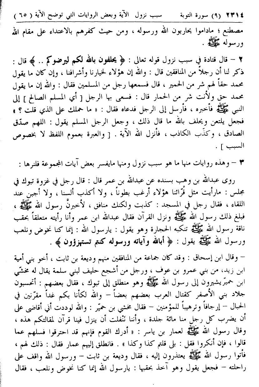 روى عبد الله بن وهب بسنده عن عبد الله بن عمر قال: قال رجل في غزوة تبوك في مجلس: ما رأيت مثل قرائنا هؤلاء أرغب بطونا، ولا أكذب ألسنا، ولا أجبن عند اللقاء، فقال رجل في المسجد: كذبت ولكنك منافق، لأخبرن رسول الله صلى الله عليه وسلم، فبلغ ذلك رسول الله صلى الله عليه وسلم ونزل القرآن فقال عبد الله ابن عمر وأنا رأيته متعلقا بحقب ناقة رسول الله صلى الله عليه وسلم تنكبه الحجارة وهو يقول: يا رسول الله: إنما كنا نخوض ونلعب ورسول الله صلى الله عليه وسلم يقول: أَبِاللَّهِ وَآياتِهِ وَرَسُولِهِ كُنْتُمْ تَسْتَهْزِؤُنَ.