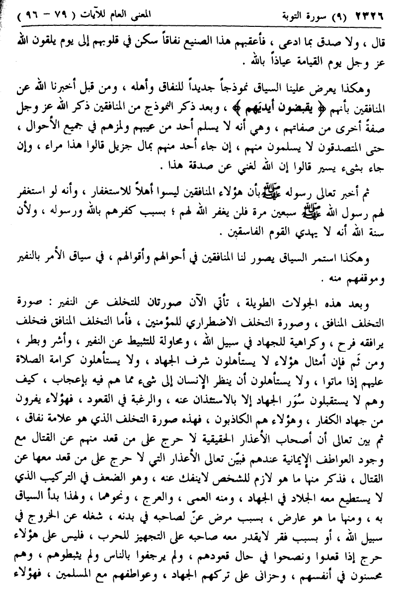 وبعد هذه الجولات الطويلة، تأتي الآن صورتان للتخلف عن النفير: صورة التخلف المنافق، وصورة التخلف الاضطراري للمؤمنين، فأما التخلف المنافق فتخلف يرافقه فرح، وكراهية للجهاد في سبيل الله، ومحاولة للتثبيط عن النفير، وأشر وبطر، ومن ثم فإن أمثال هؤلاء لا يستأهلون شرف الجهاد، ولا يستأهلون كرامة الصلاة عليهم إذا ماتوا، ولا يستأهلون أن ينظر الإنسان إلى شئ مما هم فيه بإعجاب، كيف وهم لا يستقبلون سور الجهاد إلا بالاستئذان عنه، والرغبة في القعود، فهؤلاء يفرون من جهاد الكفار، وهؤلاء هم الكاذبون، فهذه صورة التخلف الذي هو علامة نفاق، ثم بين تعالى أن أصحاب الأعذار الحقيقية لا حرج على من قعد منهم عن القتال مع وجود العواطف الإيمانية عندهم فبين تعالى الأعذار التي لا حرج على من قعد معها عن القتال، فذكر منها ما هو لازم للشخص لا ينفك عنه، وهو الضعف في التركيب الذي لا يستطيع معه الجلاد في الجهاد، ومنه العمى، والعرج، ونحوهما، ولهذا بدأ السياق به، ومنها ما هو عارض، بسبب مرض عن لصاحبه في بدنه، شغله عن الخروج في سبيل الله، أو بسبب فقر لا يقدر معه صاحبه على التجهيز للحرب، فليس على هؤلاء حرج إذا قعدوا ونصحوا في حال قعودهم، ولم يرجفوا بالناس ولم يثبطوهم، وهم محسنون في أنفسهم، وحزانى على تركهم الجهاد، وعواطفهم مع المسلمين، فهؤلاء