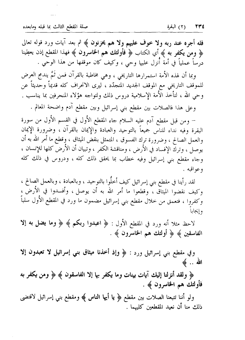 لاحظ مثلا أنه ورد في المقطع الأول: اعْبُدُوا رَبَّكُمُ وَما يُضِلُّ بِهِ إِلَّا الْفاسِقِينَ أُولئِكَ هُمُ الْخاسِرُونَ.