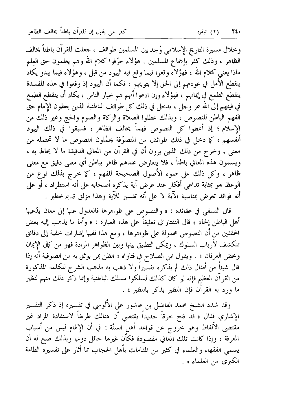 قال النسفي في عقائده: «والنصوص على ظواهرها فالعدول عنها إلى معان يدعيها أهل الباطن إلحاد» قال التفتازاني تعليقا على هذه العبارة: «وأما ما يذهب إليه بعض المحققين من أن النصوص محمولة على ظواهرها، ومع هذا ففيها إشارات خفية إلى دقائق تنكشف لأرباب السلوك، ويمكن التطبيق بينها وبين الظواهر المرادة فهو من كمال الإيمان ومحض العرفان». ويقول ابن الصلاح في فتاواه «الظن بمن يوثق به من الصوفية أنه إذا قال شيئا من أمثال ذلك لم يذكره تفسيرا ولا ذهب به مذهب الشرح للكلمة المذكورة من القرآن العظيم فإنه لو كان كذلك لسلكوا مسلك الباطنية وإنما ذكر ذلك منهم لنظير ما ورد به القرآن فإن النظير يذكر بالنظير».