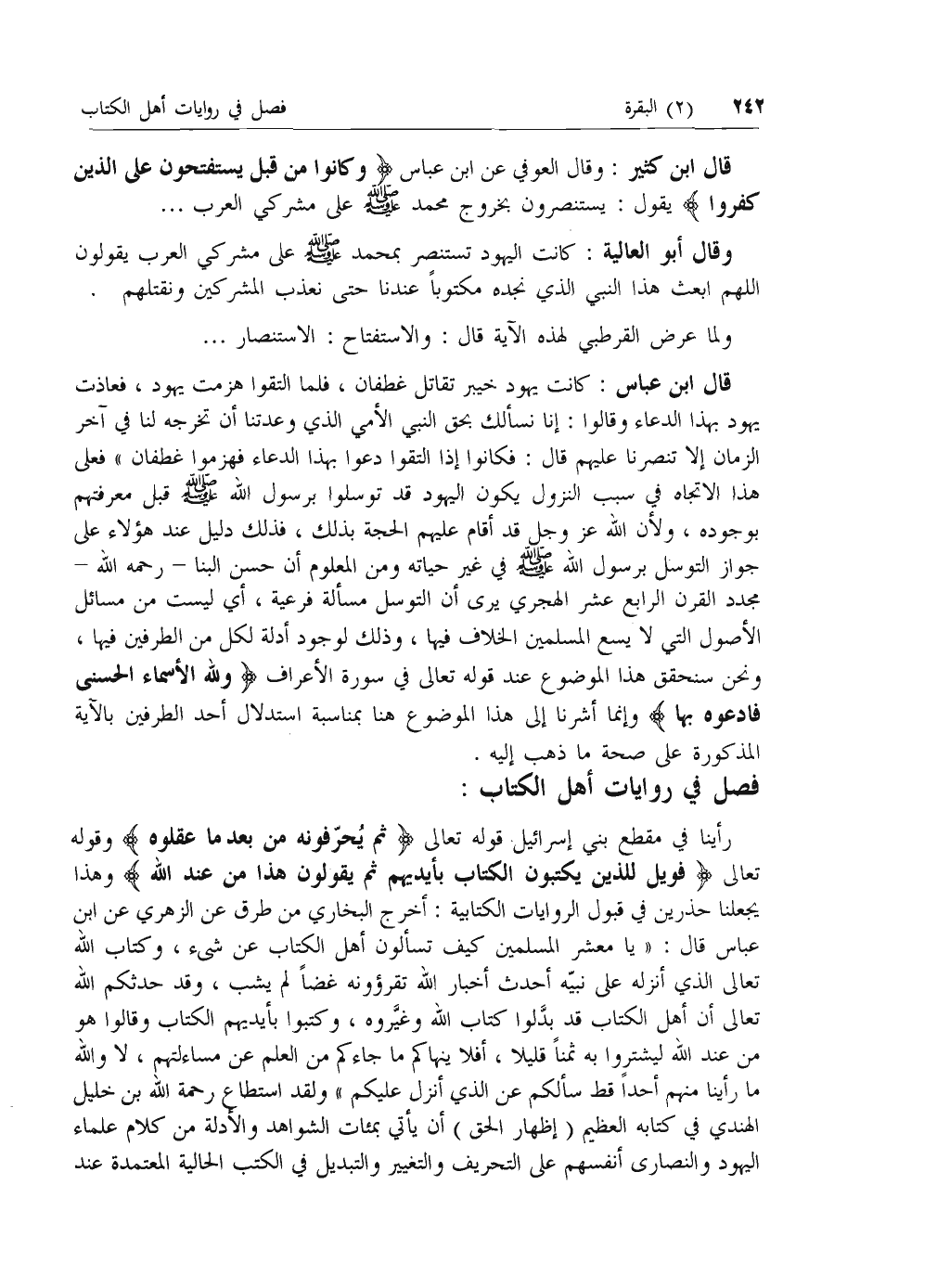 قال ابن عباس: كانت يهود خيبر تقاتل غطفان، فلما التقوا هزمت يهود، فعاذت يهود بهذا الدعاء وقالوا: إنا نسألك بحق النبي الأمي الذي وعدتنا أن تخرجه لنا في آخر الزمان إلا تنصرنا عليهم قال: فكانوا إذا التقوا دعوا بهذا الدعاء فهزموا غطفان» فعلى هذا الاتجاه في سبب النزول يكون اليهود قد توسلوا برسول الله صلى الله عليه وسلم قبل معرفتهم بوجوده، ولأن الله عزّ وجل قد أقام عليهم الحجة بذلك، فذلك دليل عند هؤلاء على جواز التوسل برسول الله صلى الله عليه وسلم في غير حياته ومن المعلوم أن حسن البنا- رحمه الله- مجدد القرن الرابع عشر الهجري يرى أن التوسل مسألة فرعية، أي ليست من مسائل الأصول التي لا يسع المسلمين الخلاف فيها، وذلك لوجود أدلة لكل من الطرفين فيها، ونحن سنحقق هذا الموضوع عند قوله تعالى في سورة الأعراف وَلِلَّهِ الْأَسْماءُ الْحُسْنى فَادْعُوهُ بِها وإنما أشرنا إلى هذا الموضوع هنا بمناسبة استدلال أحد الطرفين بالآية المذكورة على صحة ما ذهب إليه.