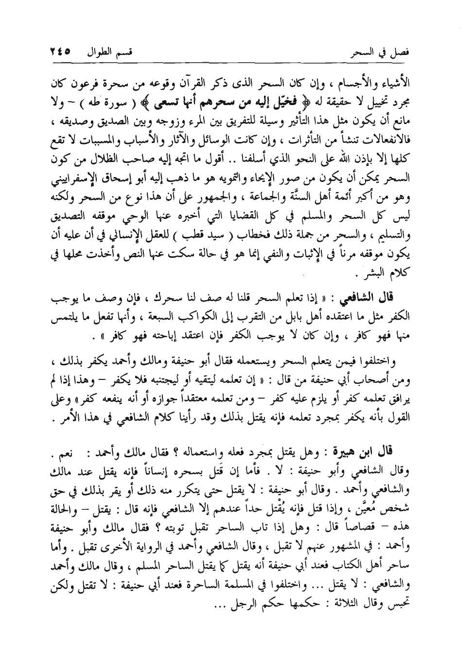 الأشياء والأجسام، وإن كان السحر الذى ذكر القرآن وقوعه من سحرة فرعون كان مجرد تخييل لا حقيقة له يُخَيَّلُ إِلَيْهِ مِنْ سِحْرِهِمْ أَنَّها تَسْعى (سورة طه) - ولا مانع أن يكون مثل هذا التأثير وسيلة للتفريق بين المرء وزوجه وبين الصديق وصديقه، فالانفعالات تنشأ من التأثرات، وإن كانت الوسائل والآثار والأسباب والمسببات لا تقع كلها إلا بإذن الله على النحو الذي أسلفنا .. أقول ما اتجه إليه صاحب الظلال من كون السحر يمكن أن يكون من صور الإيحاء والتمويه هو ما ذهب إليه أبو إسحاق الأسفرائيني وهو من أكبر أئمة أهل السنة والجماعة، والجمهور على أن هذا نوع من السحر ولكنه ليس كل السحر والمسلم في كل القضايا التي أخبره عنها الوحي موقفه التصديق والتسليم، والسحر من جملة ذلك فخطاب (سيد قطب) للعقل الإنساني في أن عليه أن يكون موقفه مرنا في الإثبات والنفي إنما هو في حالة سكت عنها النص وأخذت محلها في كلام البشر.