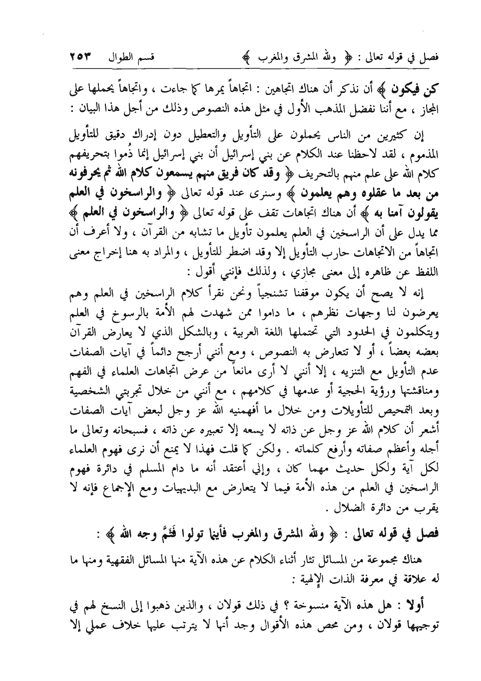 فصل في قوله تعالى: وَلِلَّهِ الْمَشْرِقُ وَالْمَغْرِبُ فَأَيْنَما تُوَلُّوا فَثَمَّ وَجْهُ اللَّهِ: